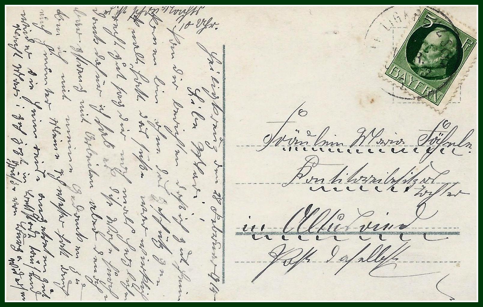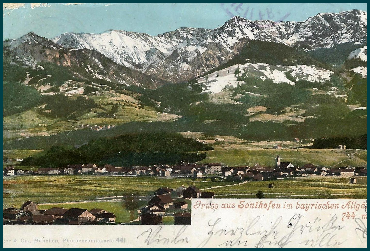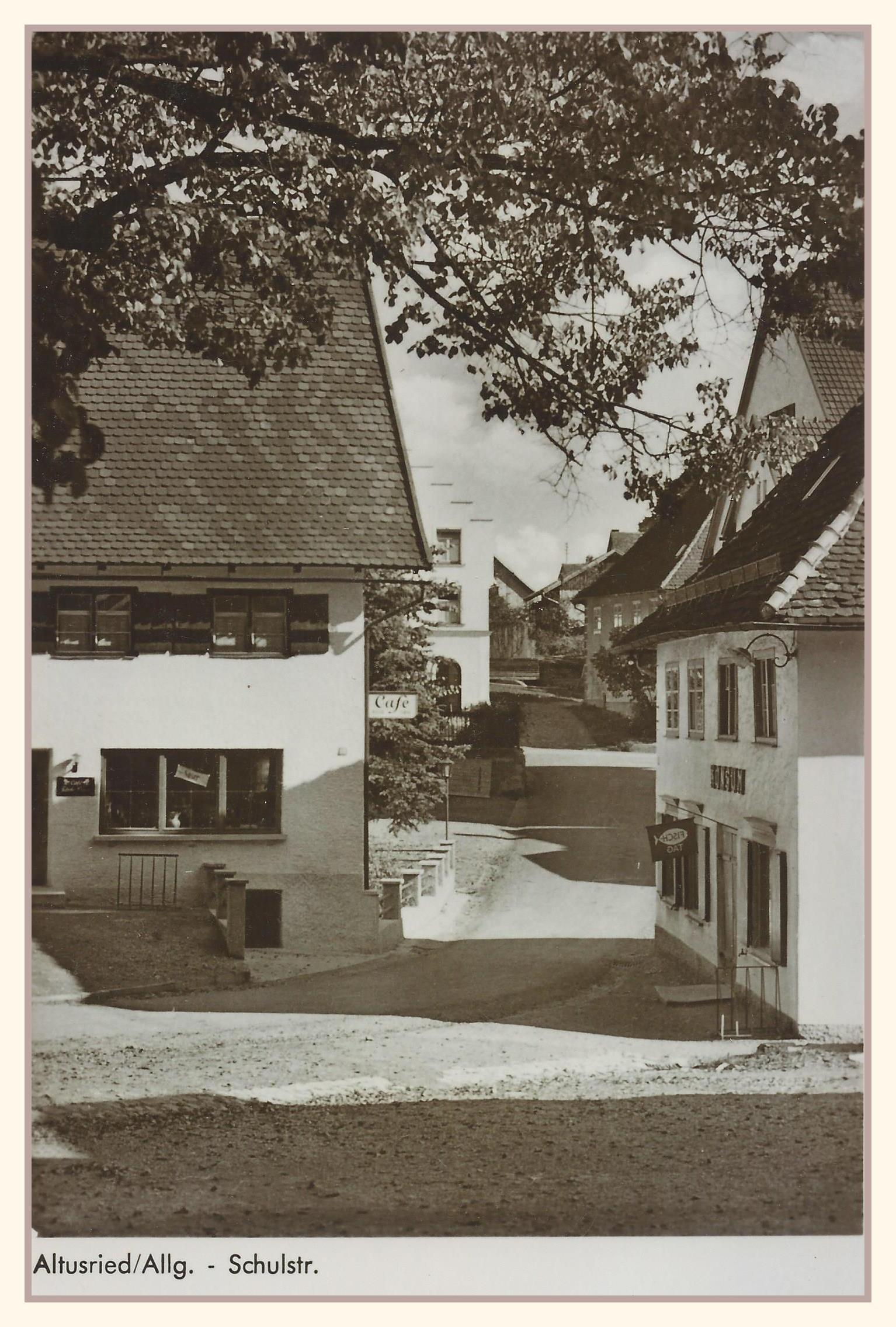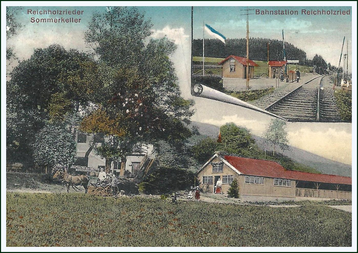 Postkarte an Senzi Maier ( aus der Fähnleverwandtschaft ) mit den Motiven Bahnstation Reicholzried und Sommerkeller. Die Bahnstationen waren damals noch von erheblicher Bedeutung.Die Bahnstation Reicholzried am Schorenmoos war die Altusried nächst gelegene Bahnstation. Man erreichte den Bahnhof über die Illerfähre bei Buch und den Ort Reicholzried. Den Nachbarort schrieb man damals noch mit Doppel h, also Reichholzried. Der Ortsname bedeutet aber nicht reich an Holz, sondern kommt von Richoldsried, das heißt Rodung des Richold.