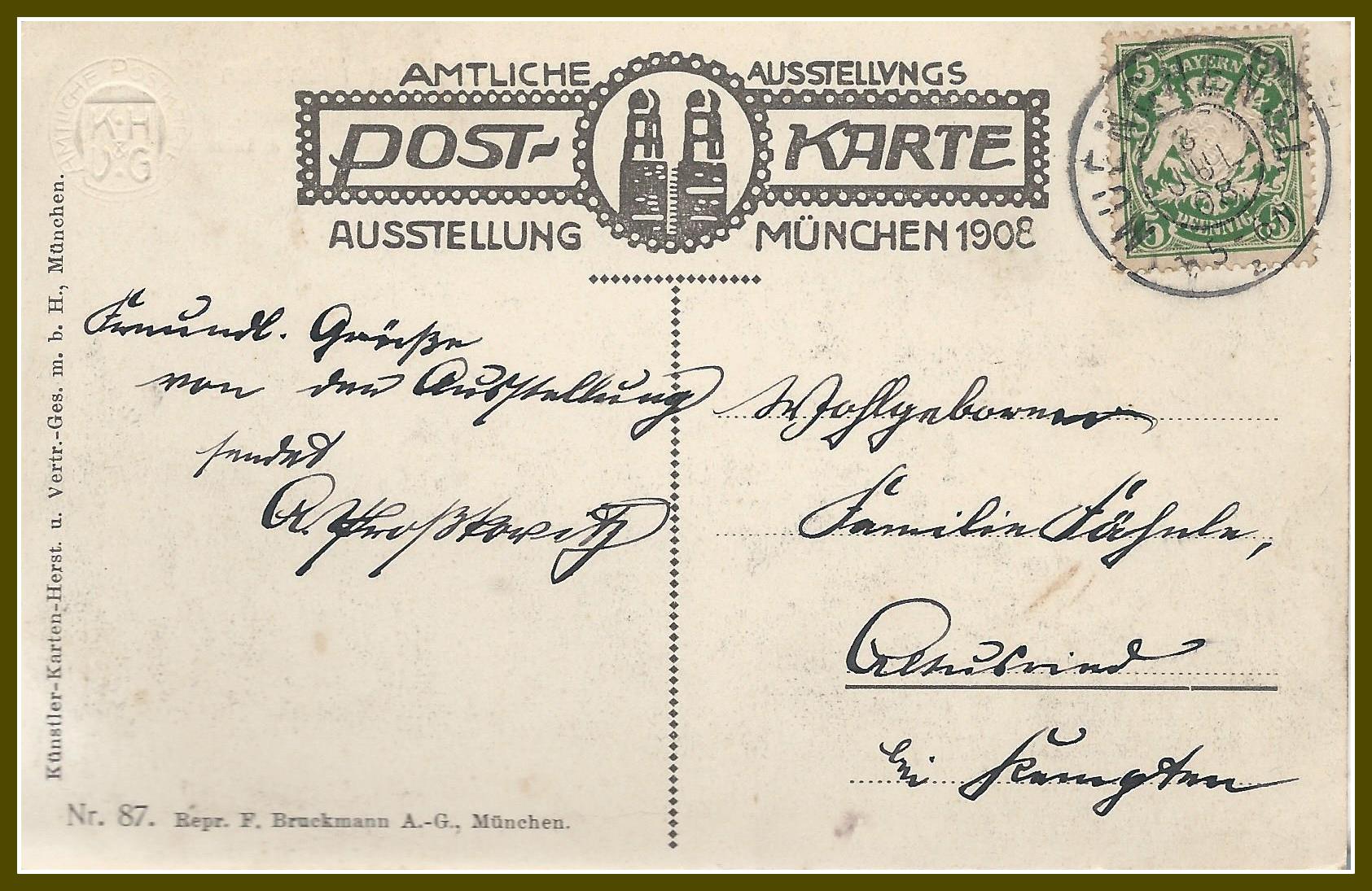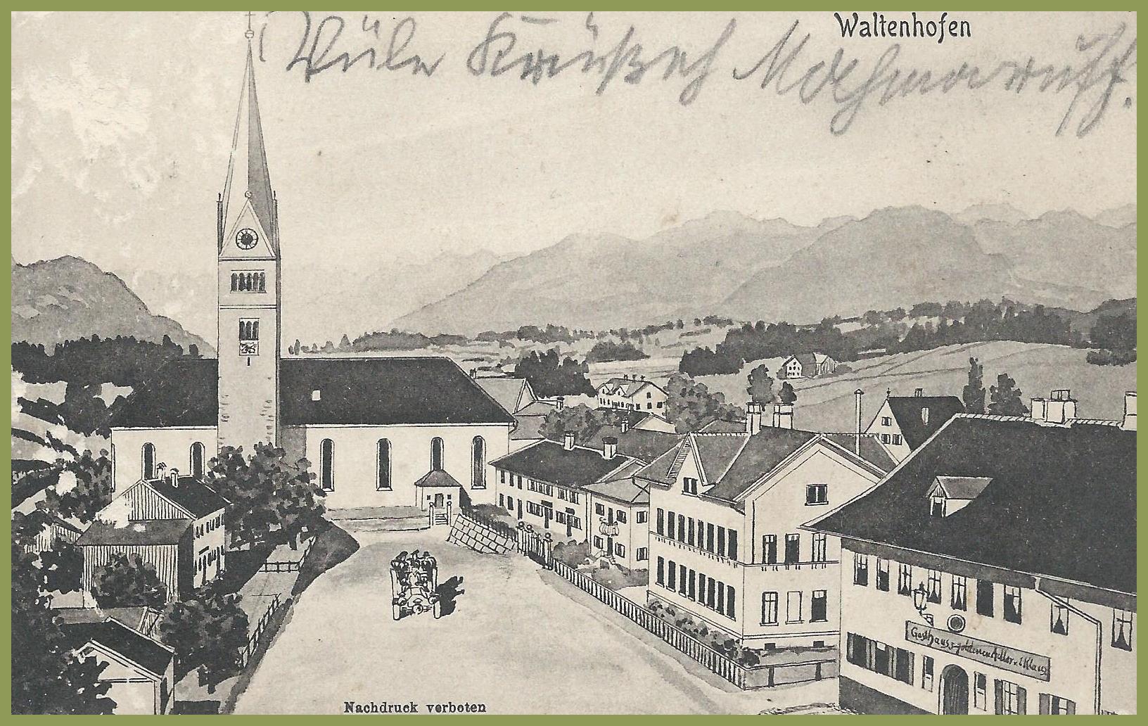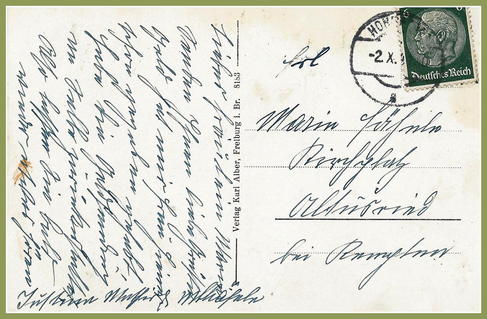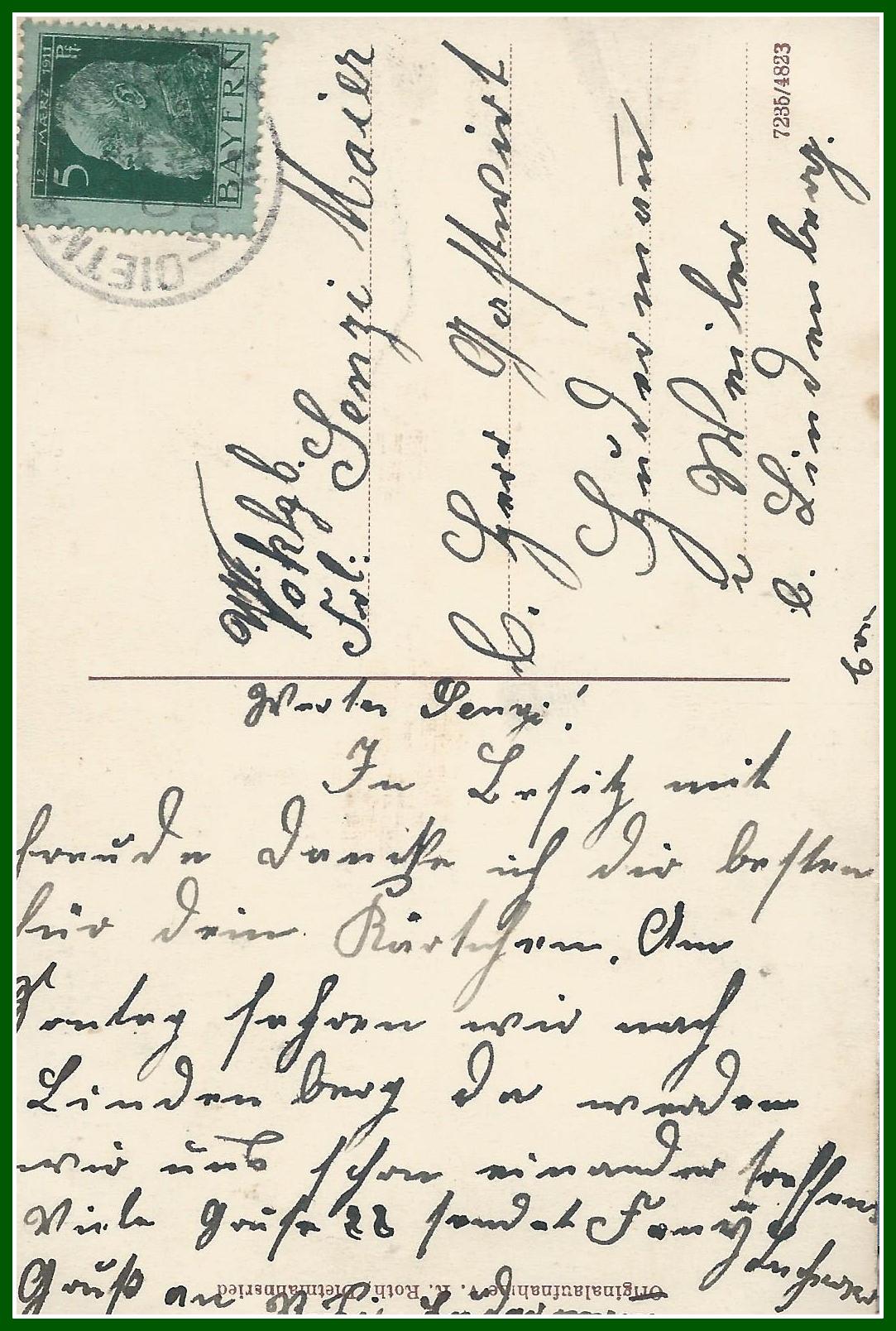 Postkarte an Senzi Maier ( aus der Fähnleverwandtschaft ) mit den Motiven Bahnstation Reicholzried und Sommerkeller. Die Bahnstationen waren damals noch von erheblicher Bedeutung.Die Bahnstation Reicholzried am Schorenmoos war die Altusried nächst gelegene Bahnstation. Man erreichte den Bahnhof über die Illerfähre bei Buch und den Ort Reicholzried. Den Nachbarort schrieb man damals noch mit Doppel h, also Reichholzried. Der Ortsname bedeutet aber nicht reich an Holz, sondern kommt von Richoldsried, das heißt Rodung des Richold.