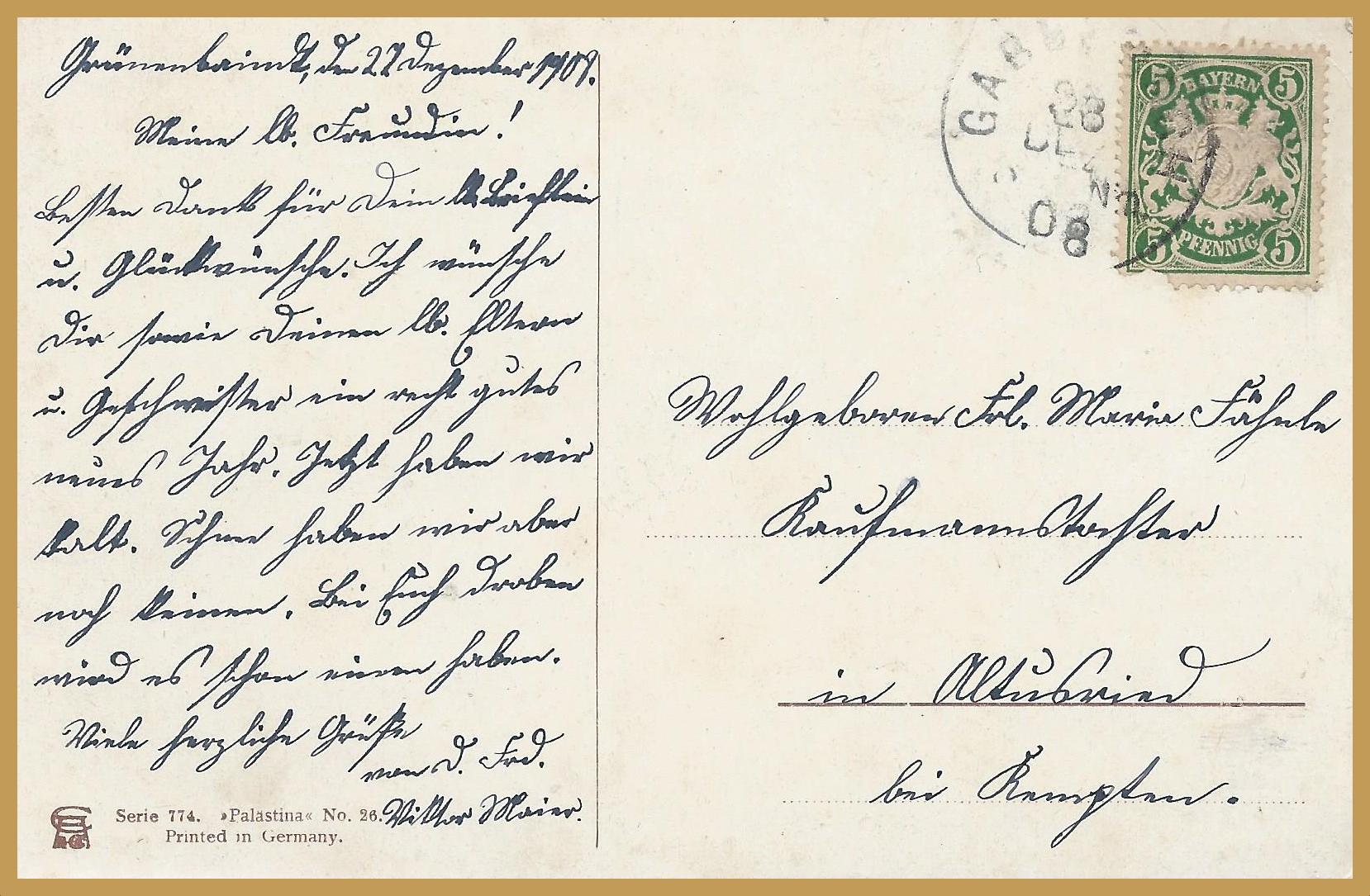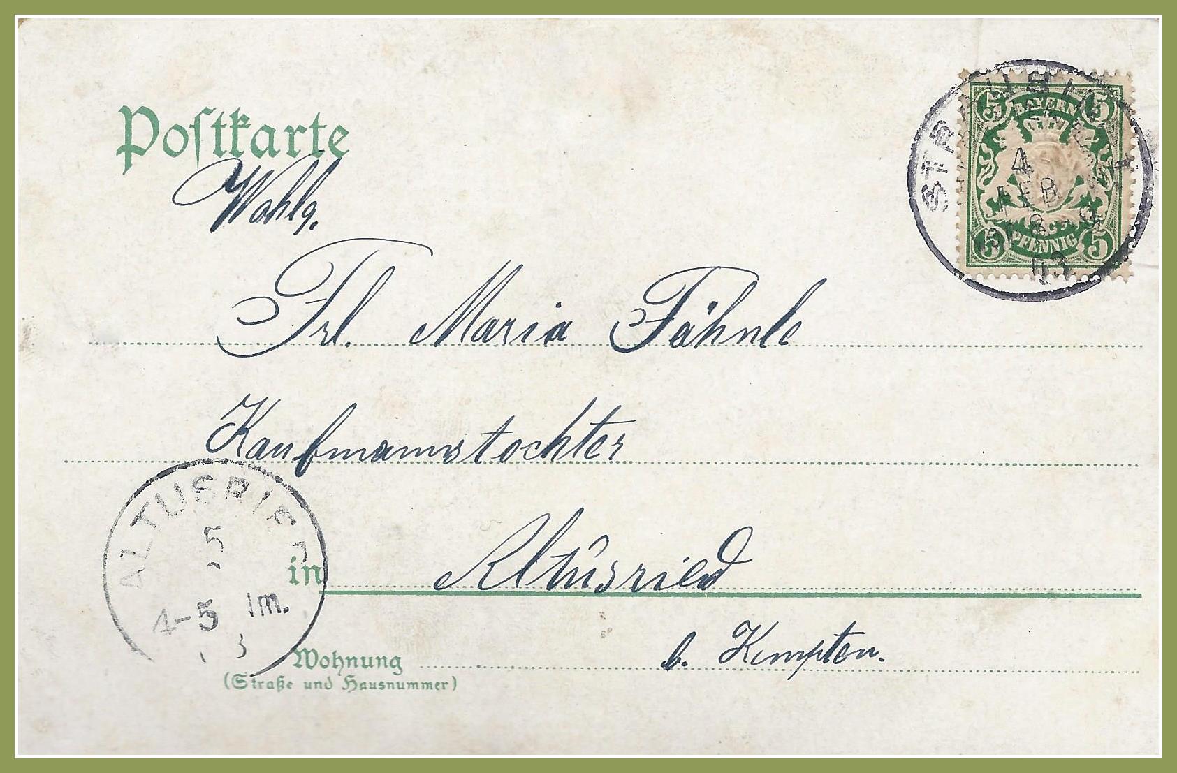 Die Tochter von Georg Fähnle war Maria Fähnle. Sie war die Adressatin von vielen Bildpostkarten, die sie sorgsam aufbewahrte. Maria blieb ledig und wohnte im Austragsstüble. Auf den Postkarten hieß die Anrede zumeist: Wohlgeboren Fräulein Fähnle Maria Kaufmannstochter in Altusried bei Kempten.