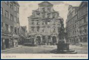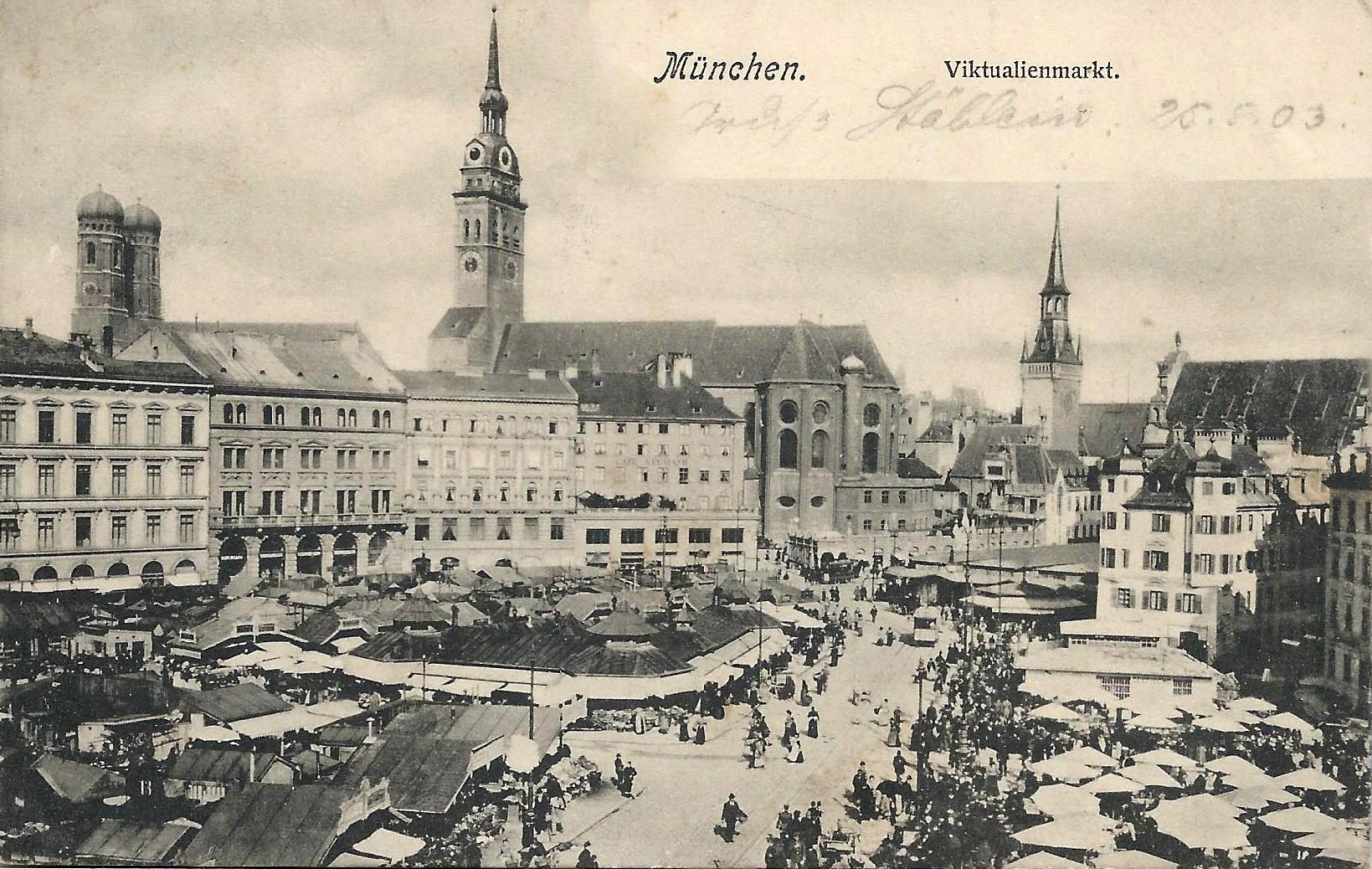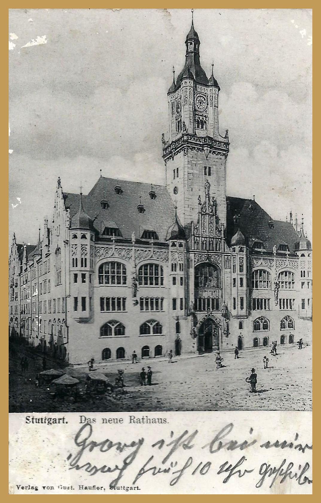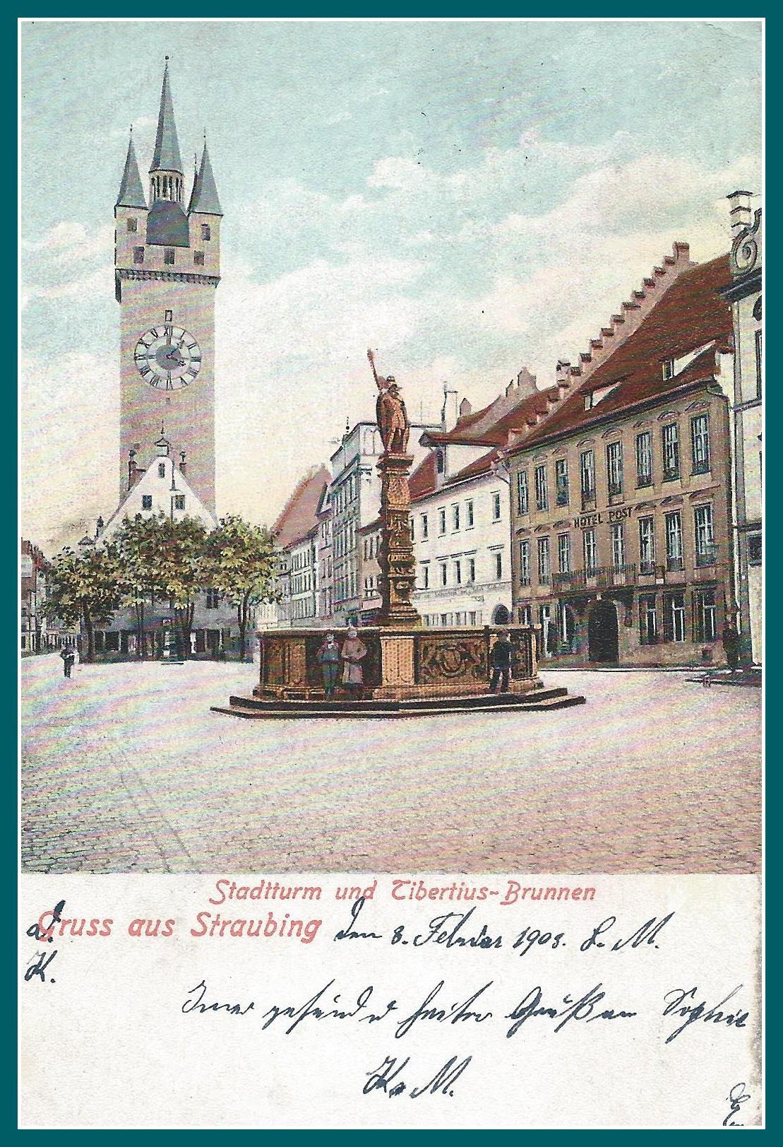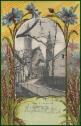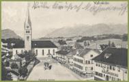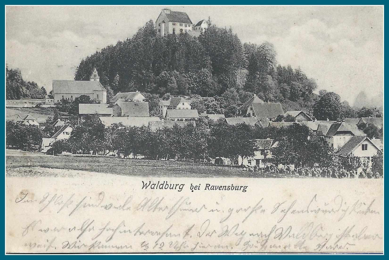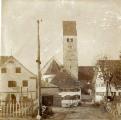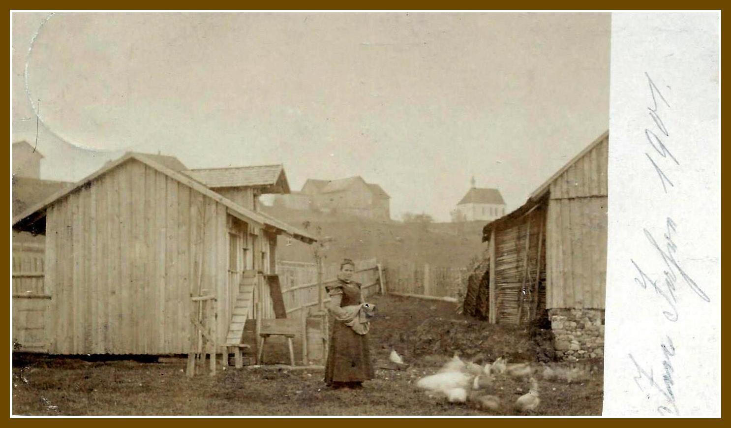 Im Jahre 1901. Postkarte an Sophie Fähnle. Beim Hühnerfüttern. Im Hintergrund die Magnuskapelle und der Lingg Hof.