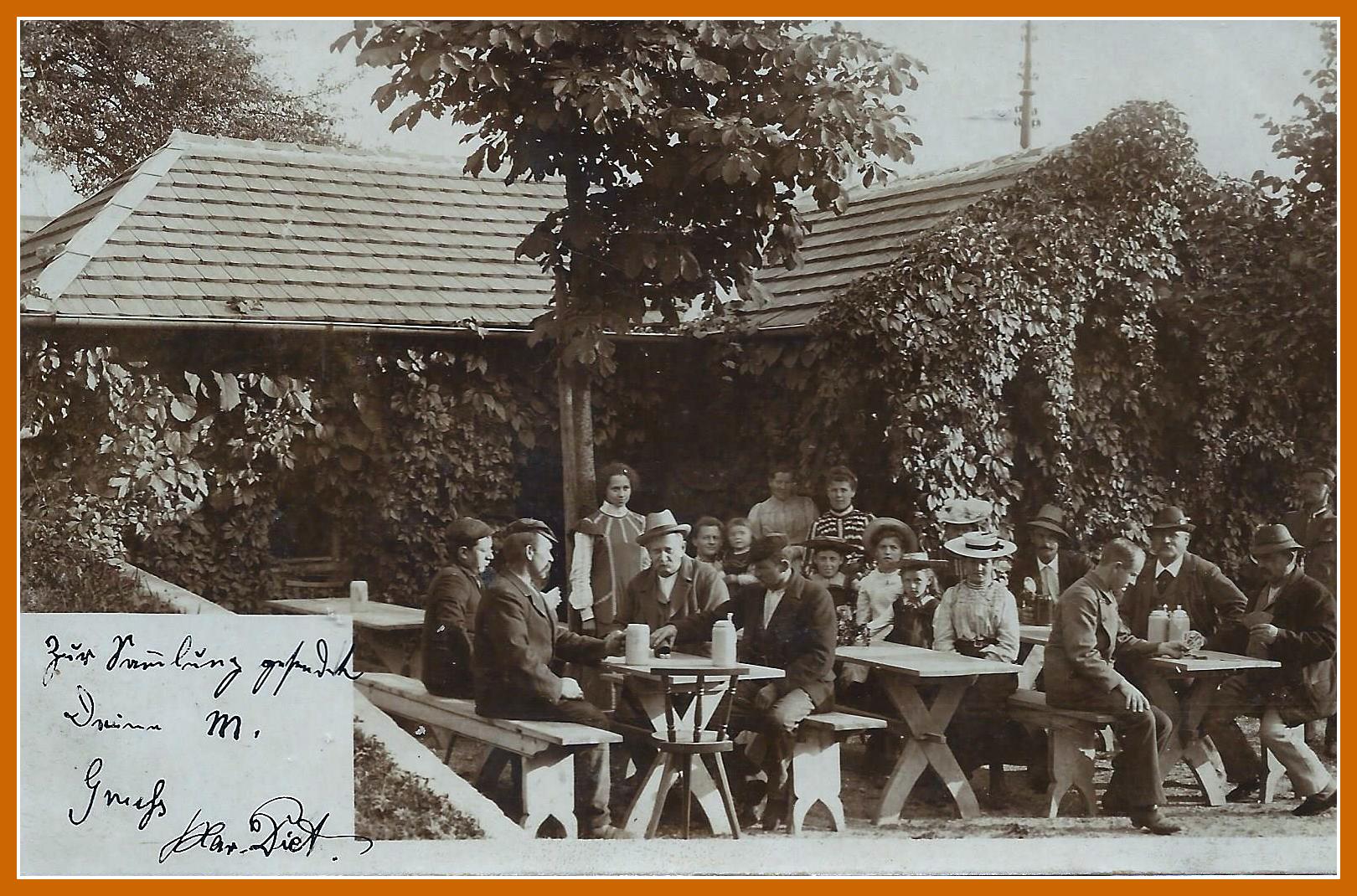 Georg Fähnle,geb. 1850 und Xaver Diet, (1871- 1951) sitzen am Tisch und senden eine Postkarte an Maria Fähnle für ihre Sammlung. Text: Zur Sammlung gesendet. Deine M. Gruß Xaver Diet.