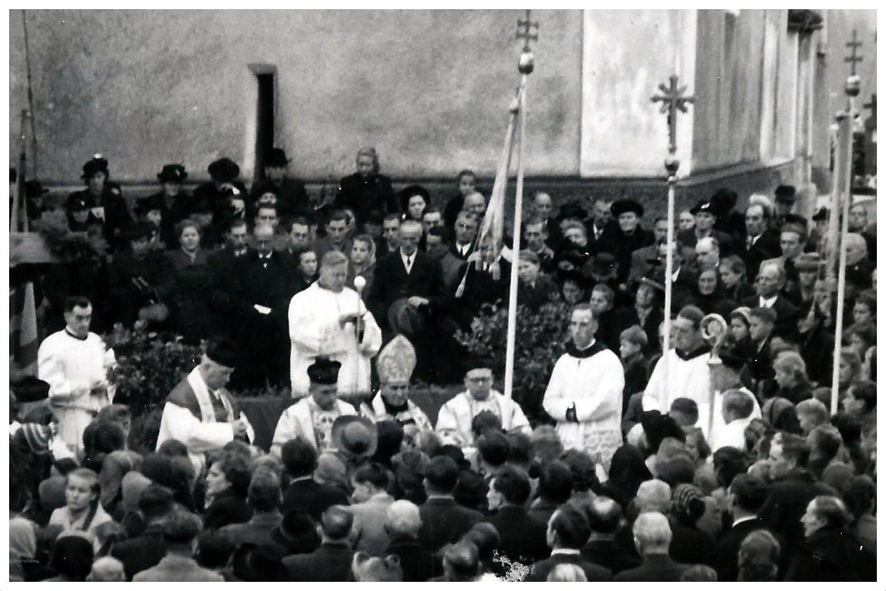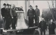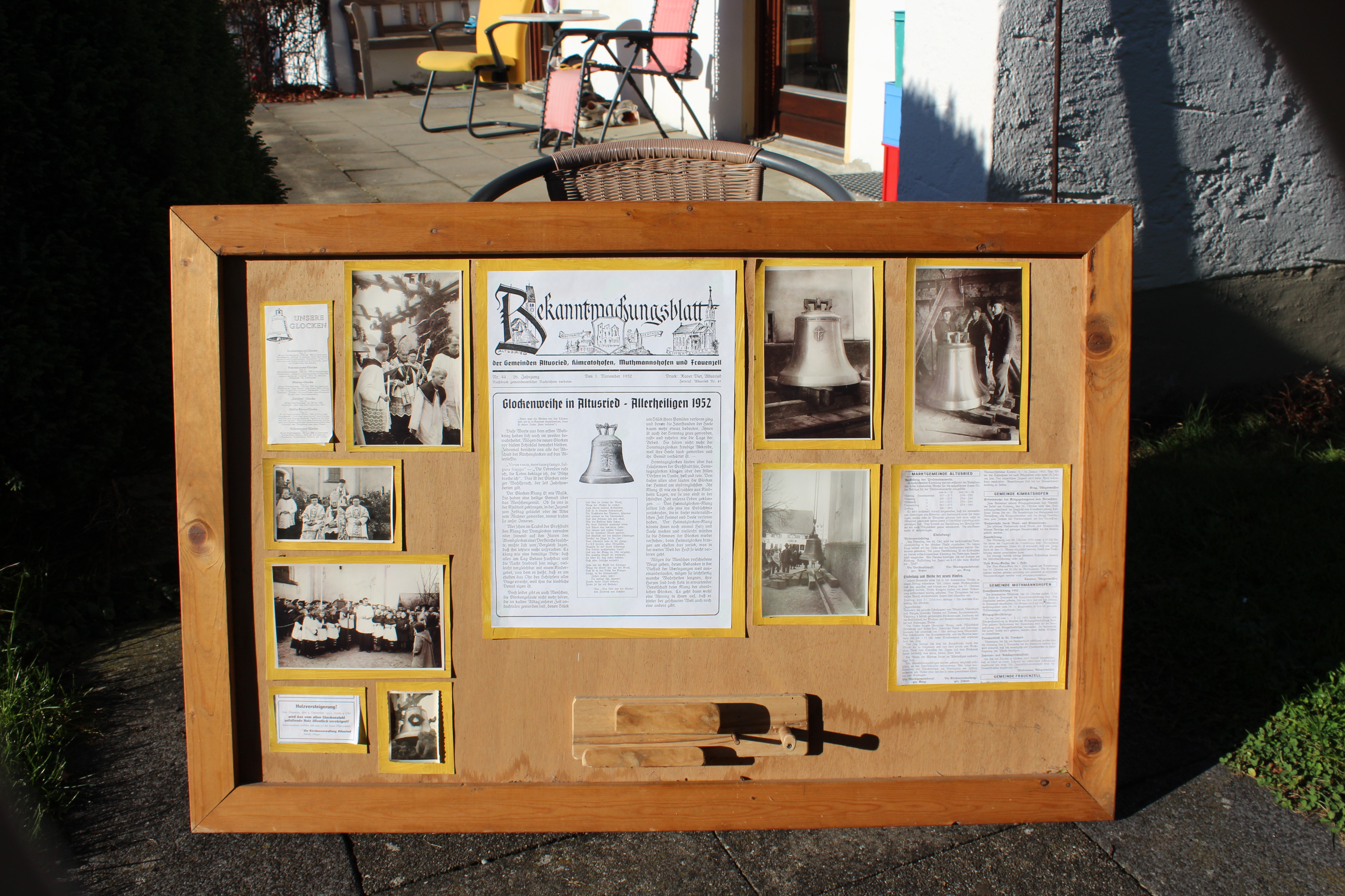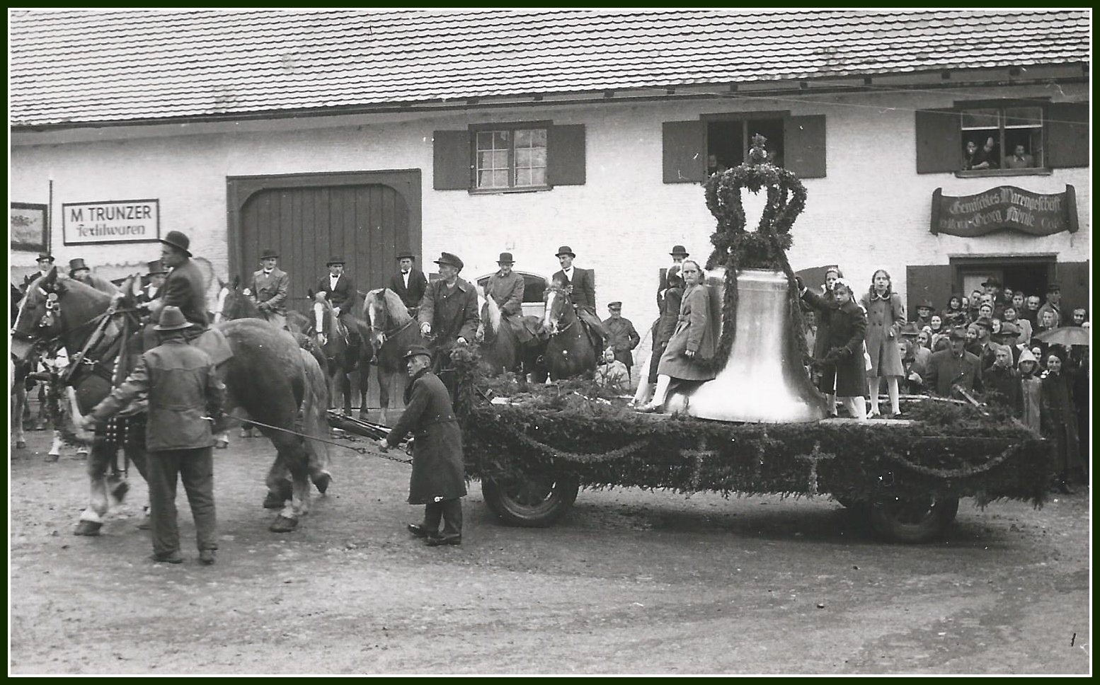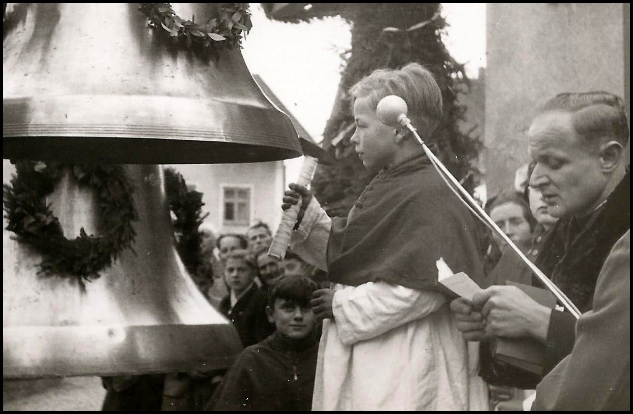 Die Glockenweihe war ein großes Ereignis. Es wurde nun allen offenbar, die Kriegszeiten sind vorbei. Der Friede ist da. Auf feierliche Weise wurden die Glocken eingeholt. So wie eine hochgestellte Persönlichkeit wurden sie am Ortsrand empfangen und zur Kirche geleitet. Reiter, Schuljugend, die Harmoniemusik, Vereine,Wagen und Kutschen begleiteten sie. Die Weihe durch den Ottobeurer Abt und gebürtigen Altusrieder Joseph Maria Einsiedler geschah am nächsten Tag, Allerheiligen, den 1. November 1952. Fotos von Siegfried Bösele.
