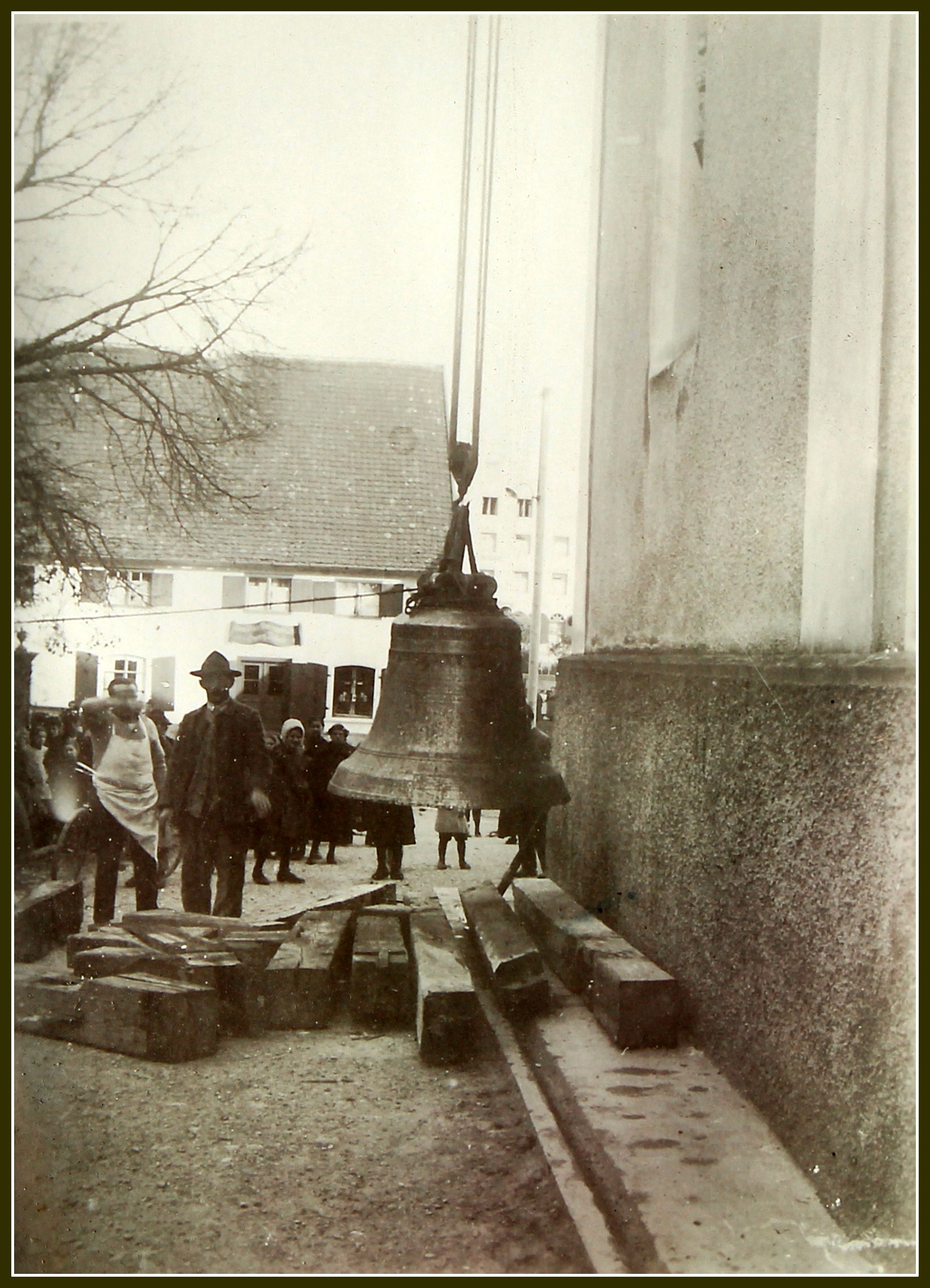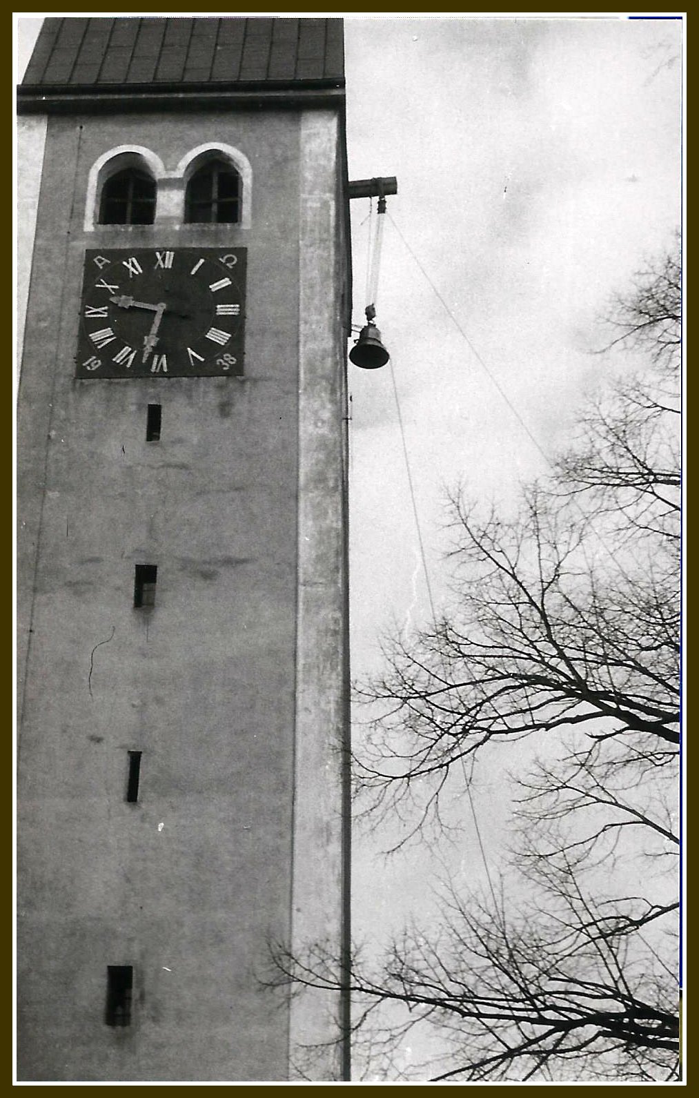Die neuen Glocken waren zu groß, deshalb mussten die Rundbogenfenster unten ausgebrochen werden. Am Zustand des Turmes erkennt man auch, dass der Turm jahrzehntelang nicht mehr renoviert worden war. Weder in der Kriegszeit noch in der ersten Nachkriegszeit gab es hierfür die Mittel.