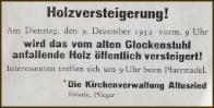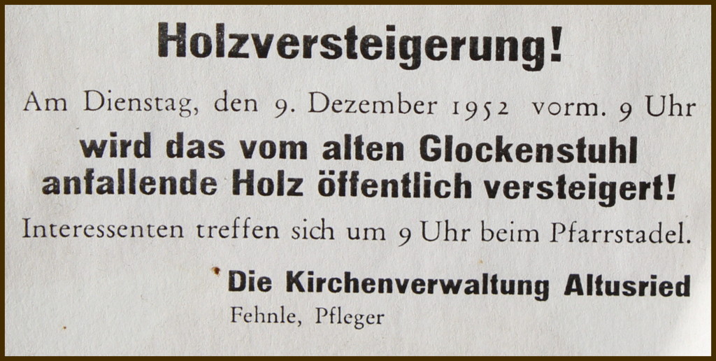 Am 9. Dezember 1952 wurde das vom alten Glockenstuhl anfallende Holz öffentlich versteigert.