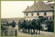 Ein Primizzug führt an der Metzgerei Bartenschlager vorbei. Der Primiziant sitzt in der Kutsche.