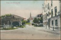 - Schule und Hauptstraße 1927. Links vor dem Stiefenhofer Haus ist eine Widderpumpe. Dieser Mechanismus nutzt den Druckstoß um einen Teil des Wassers, mit dem die Pumpe angetrieben wird, auf ein höheres Niveau zu heben.
