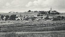 173 Jahre und fünf Generationen sind vergangen. Wir sehen Kimratshofen, wie es war. Auf dem Berg steht der Vorgängerbau der heutigen Kirche . Von ihr blieb nur der Turm aus Tuffstein, er wurde aber durch einen Aufbau im neugotischen Stil wesentlich erhöht. Im Vordergrund eine Weide mit drei Kühen und dem Hirten, umgeben von einem Holzzaun. Man sieht es sind zwei Dörfer, Oberhofen auf dem Berg mit der Kirche und in der Ebene Kimratshofen.