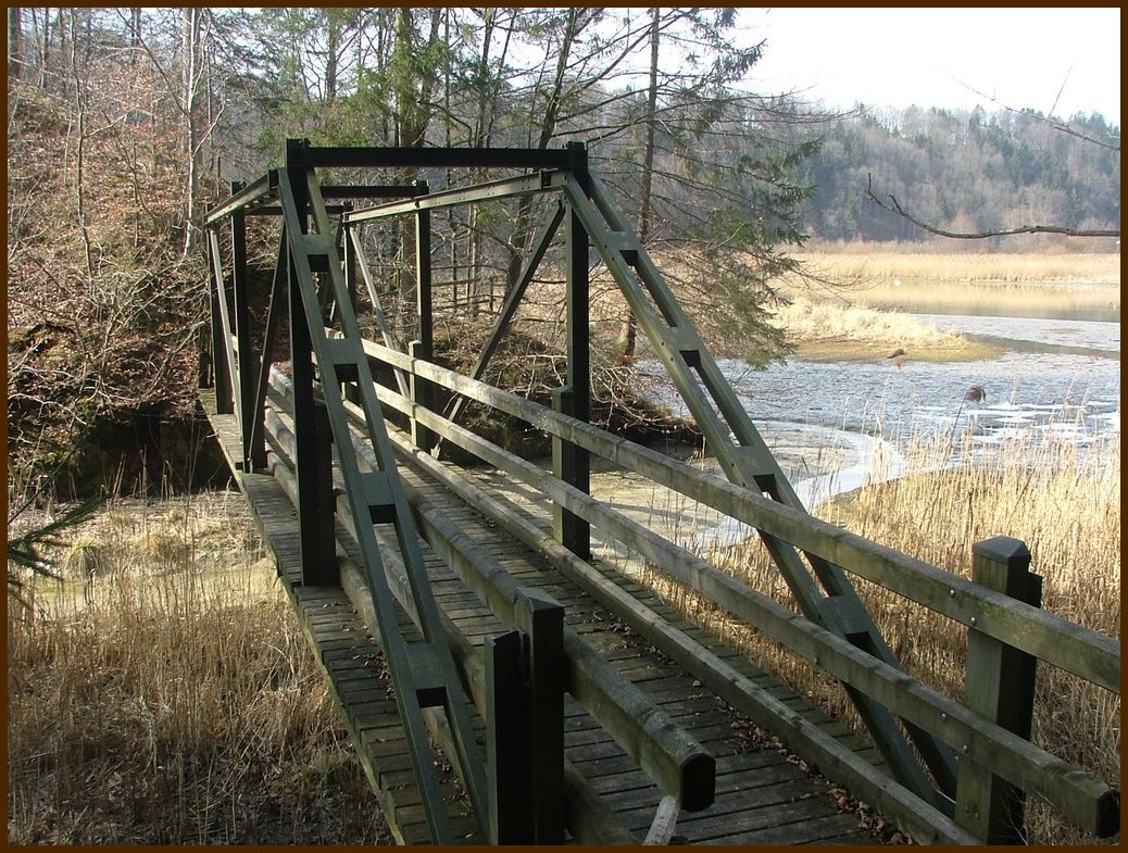 Vom Ort Altusried, vorbei am Sutterhof und Käferloh führt ein Fußweg hinunter nach Buch an der Iller. Stufen erleichtern das Gehen an dem steilen Hang und ein Geländer gibt Sicherheit. Eine Brücke überquert den Bach. Auf der Brücke steht ein Mann im Anzug. Heute ist es zumeist sehr einsam an der Iller. Nur selten trifft man einen Wanderer an. Aber nach wie vor ist die LEW als Bauherr der Staustufe verpflichtet, die Brücke und die Wege zu unterhalten.