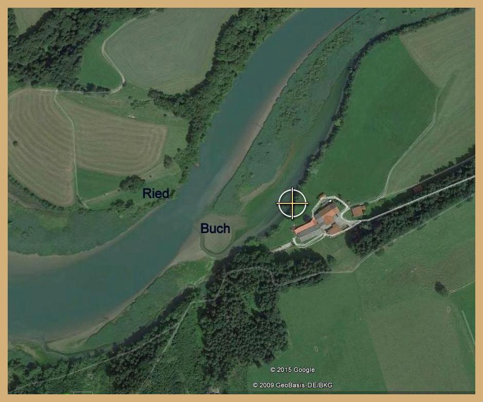 - Blick von Buch nach Ried. Nach dem Aufstau der Iller wurde der Riedhanser Hof abgebrochen. Dagegegen blieb der höher gelegene Hof in Buch erhalten.