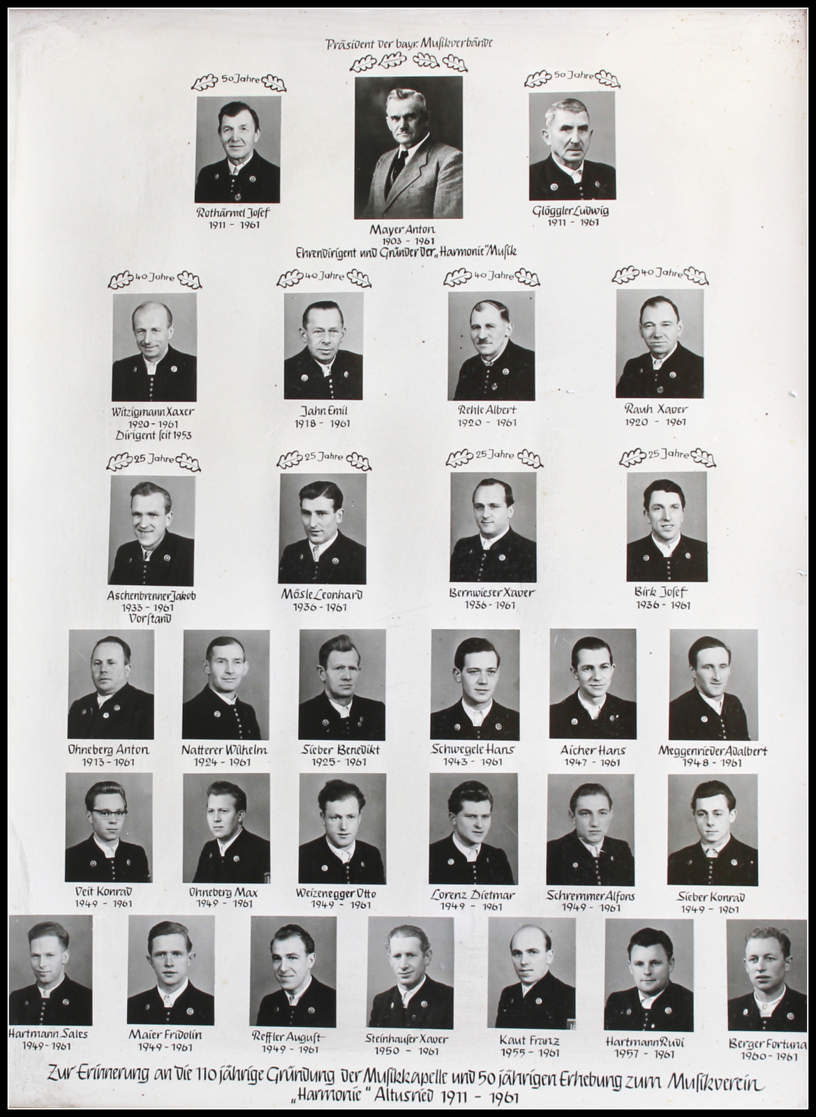 1961 Jubiläum der Harmonie Musik. Witzigmann Xaver war Dirigent seit 1953. Mayer Anton war Ehrendirigent und Gründer der Harmonie Musik.