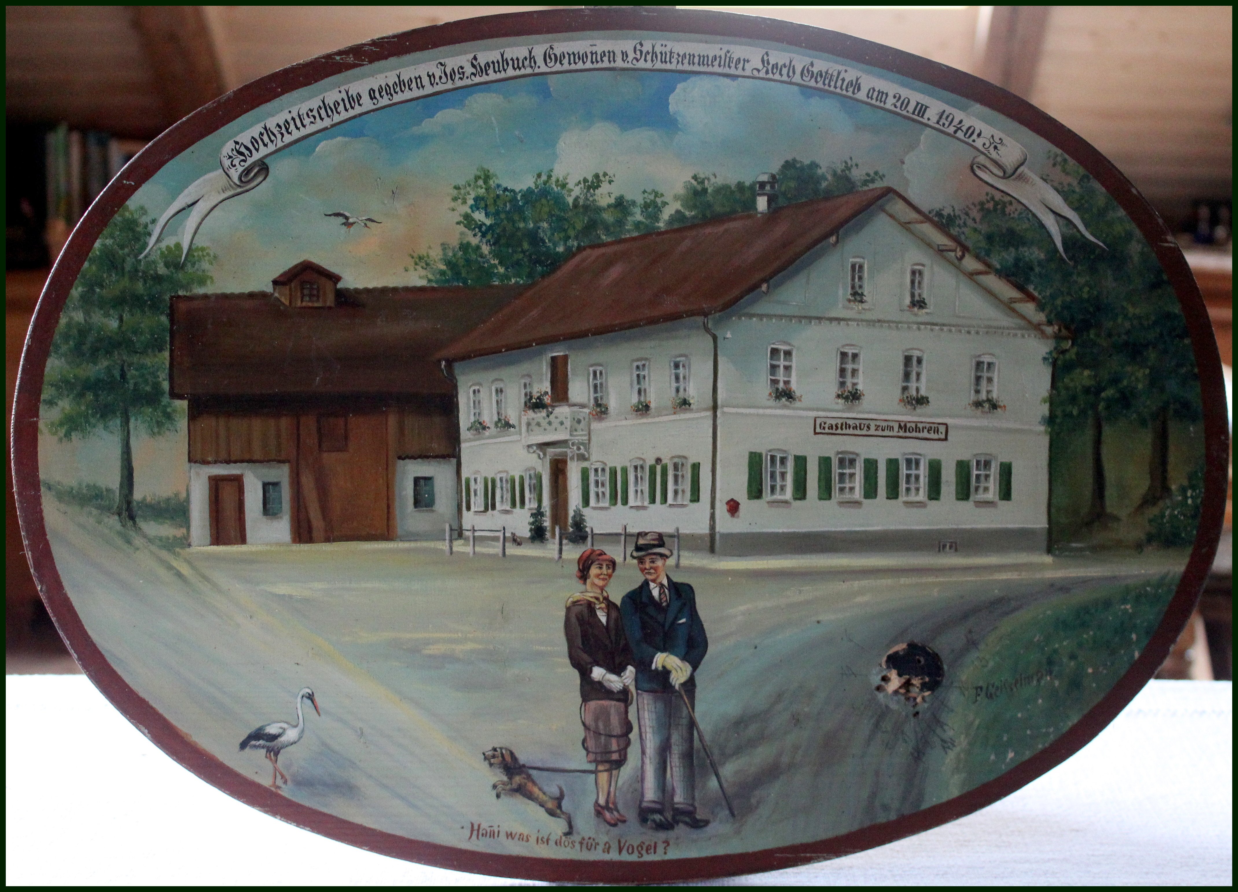 1940 Vor dem Gasthaus zum Mohren in Binzen steht das frisch getraute Ehepaar Heubuch. Ein Hündchen kläfft und zerrt an der Leine. Gleich daneben ist ein Storch gelandet.Der Mann fragt: " Hanni, was ist das für ein Vogel ? " Gewonnen hat die ovale Scheibe Schützenmeister Gottlieb Koch.