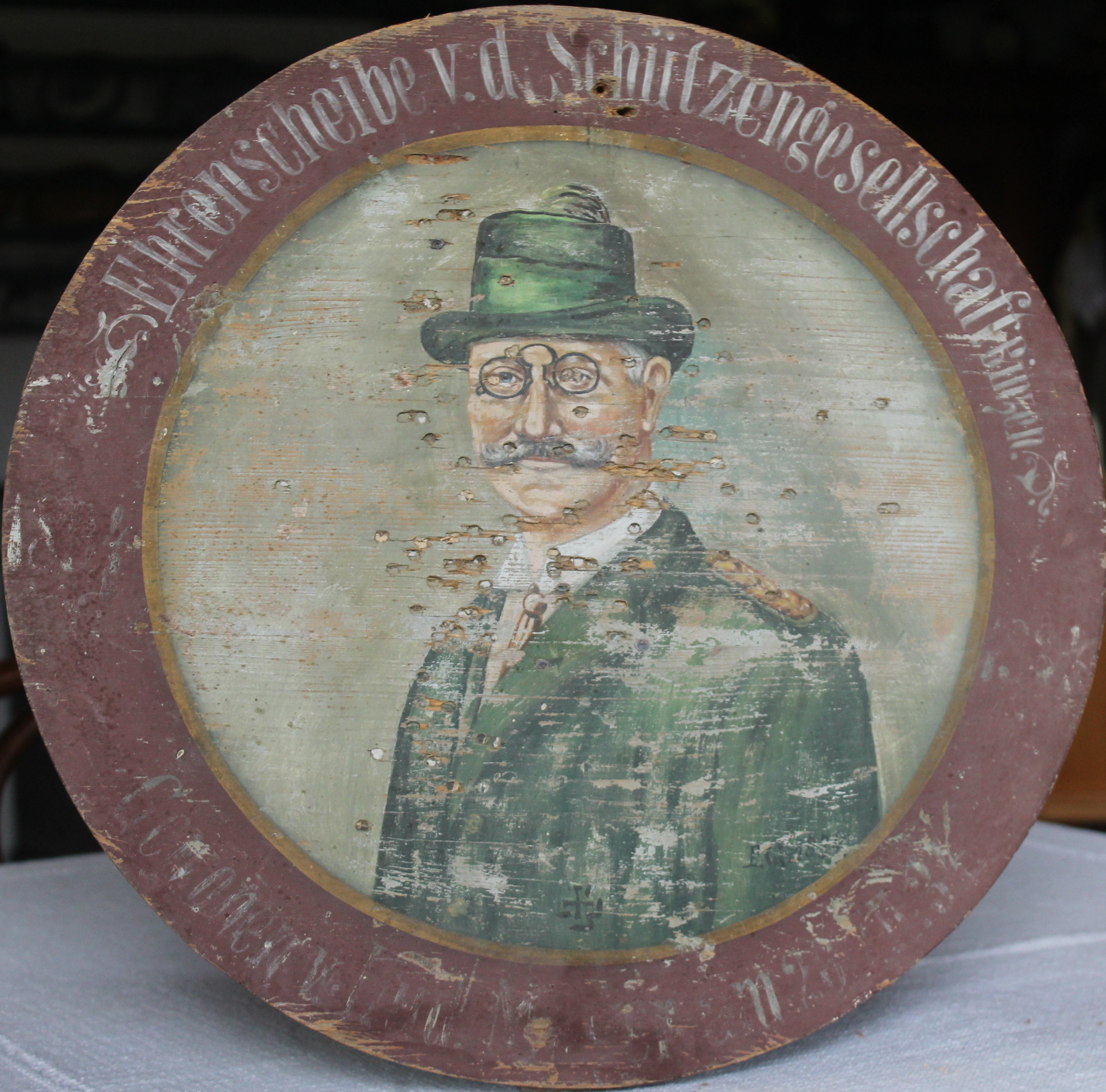 1937 Es handelt sich um eine Ehrenscheibe der Schützengesellschaft Binzen für Dr. Eberler. Eberler hat sich als Arzt und Träger vieler Ehrenämter in Altusried verdient gemacht. Geißelmann malte ihn im grünen Jägeranzug mit Brille und gezwiebeltem Schnurrbart.