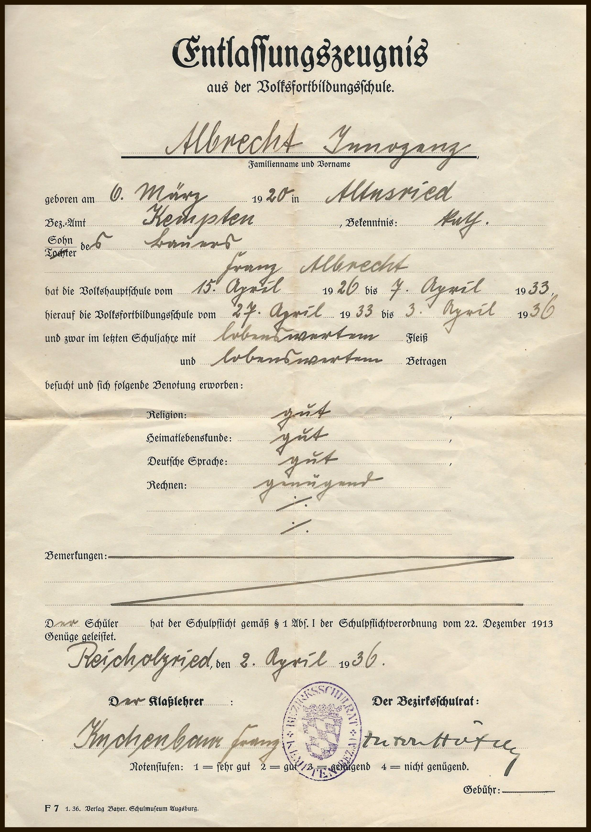 Entlassungszeugnis 1936. Lehrer Franz Kechenbaur schrieb Innozens ein gutes Zeugnis. Ausgestellt wurde es in Reicholzried. Inno war sicher Hirtenbub im Nachbarort.