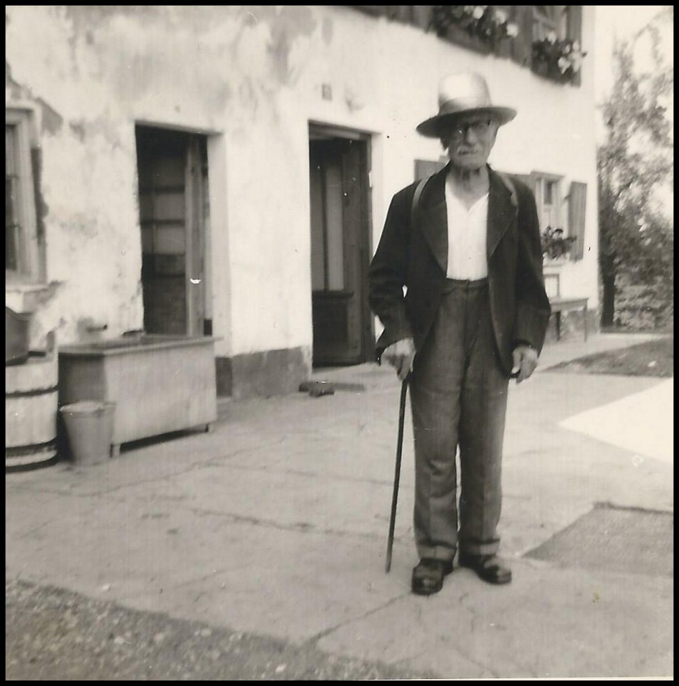 Bild 1. Drei Generationen Albrecht. Die Wasserpumpe auf der Giebelseite ist nun modernisiert. Sie wird von einem Motor angetrieben. Am Hauseingang der Brunnen.