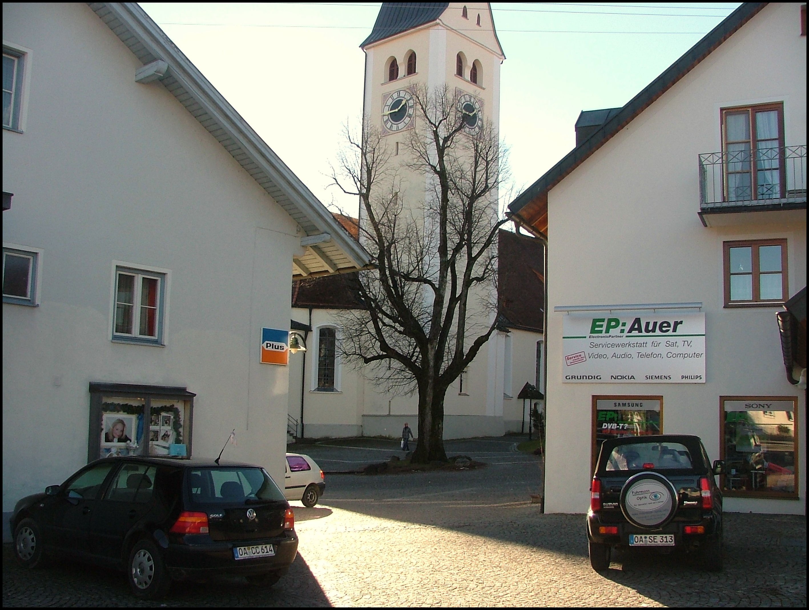 - Geht man vom Marktplatz zum Kirchplatz ist rechts das Geschäftshaus Auer/Fuhrmann. Hier stand einst seit 1800, das Schul- und Lehrerhaus.