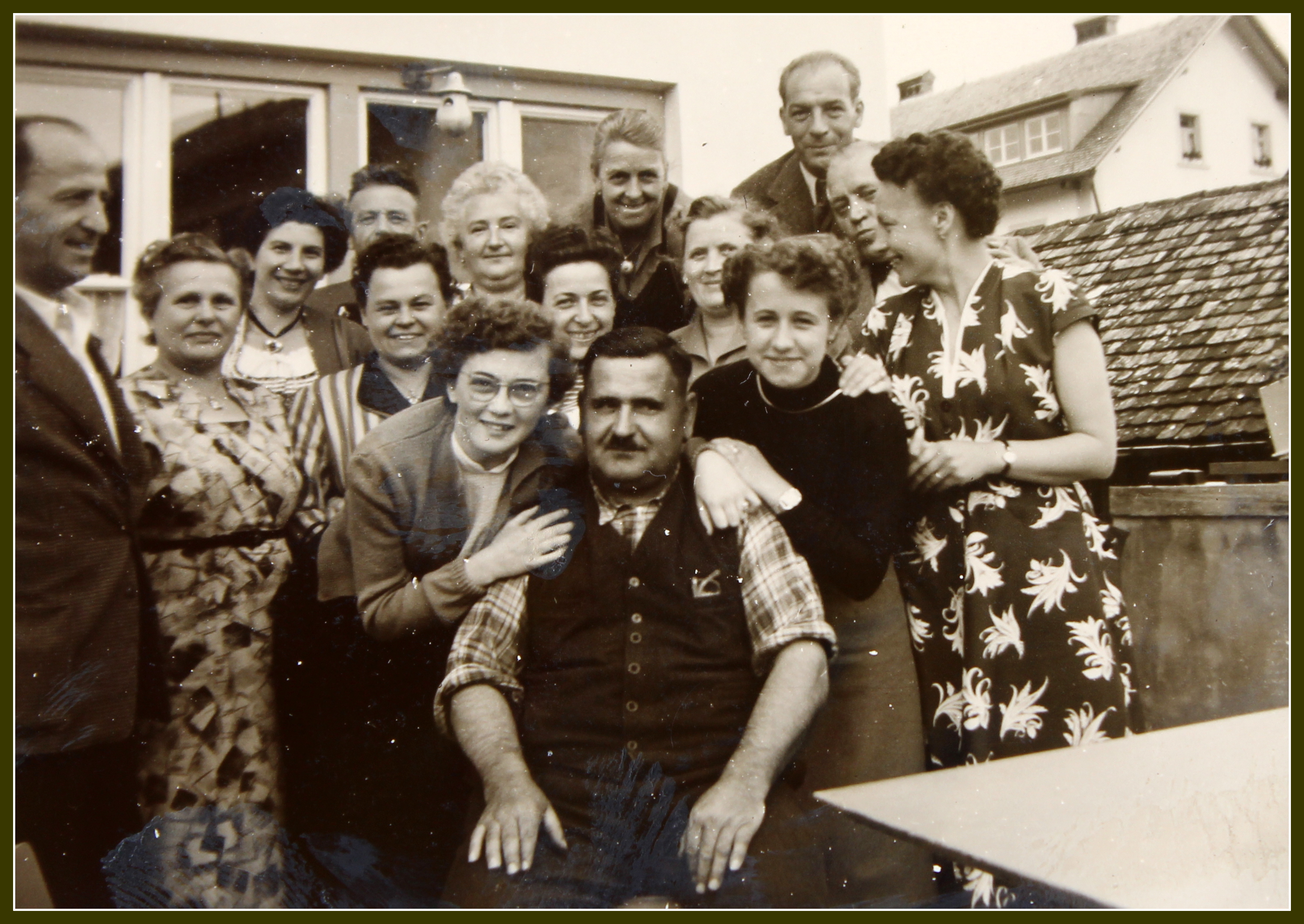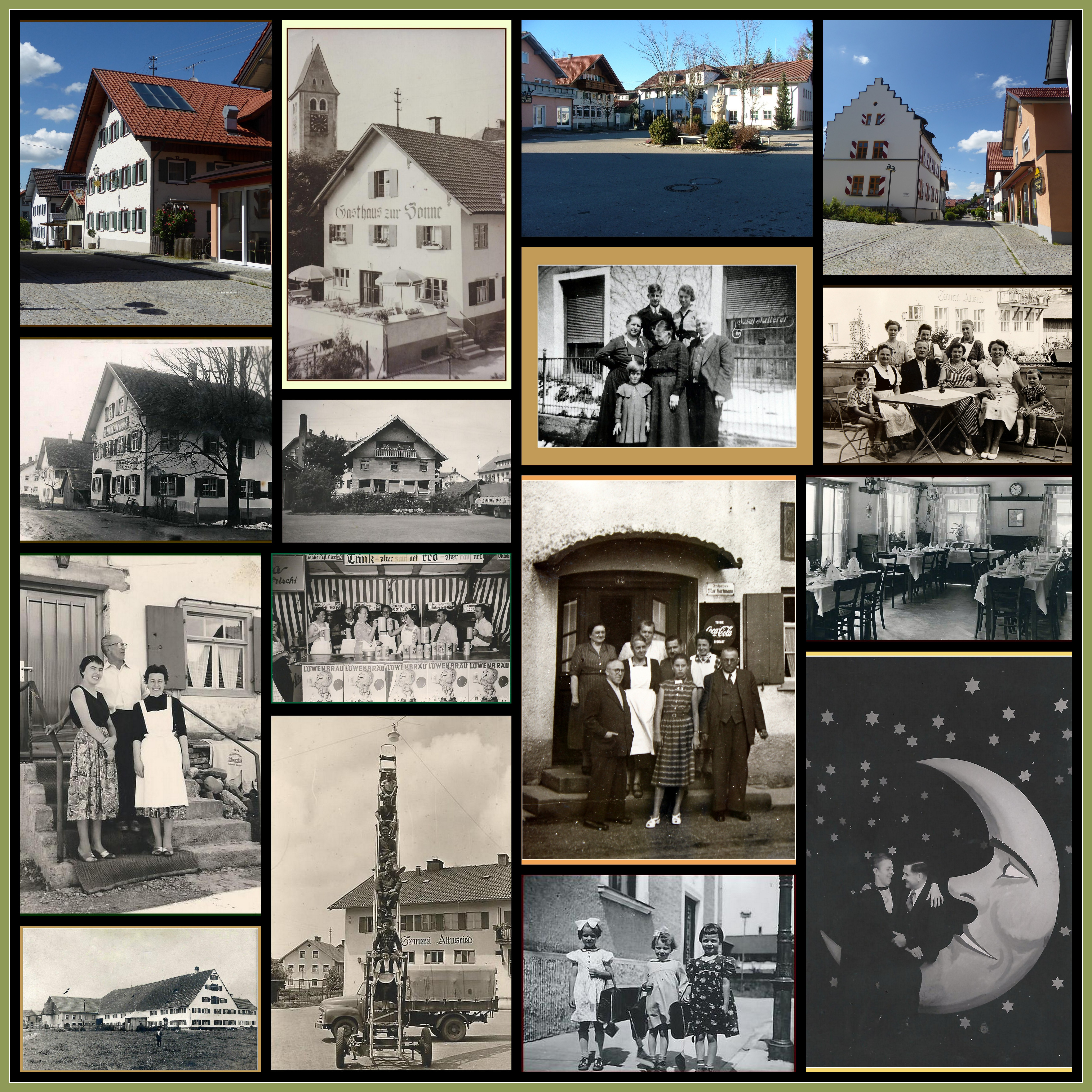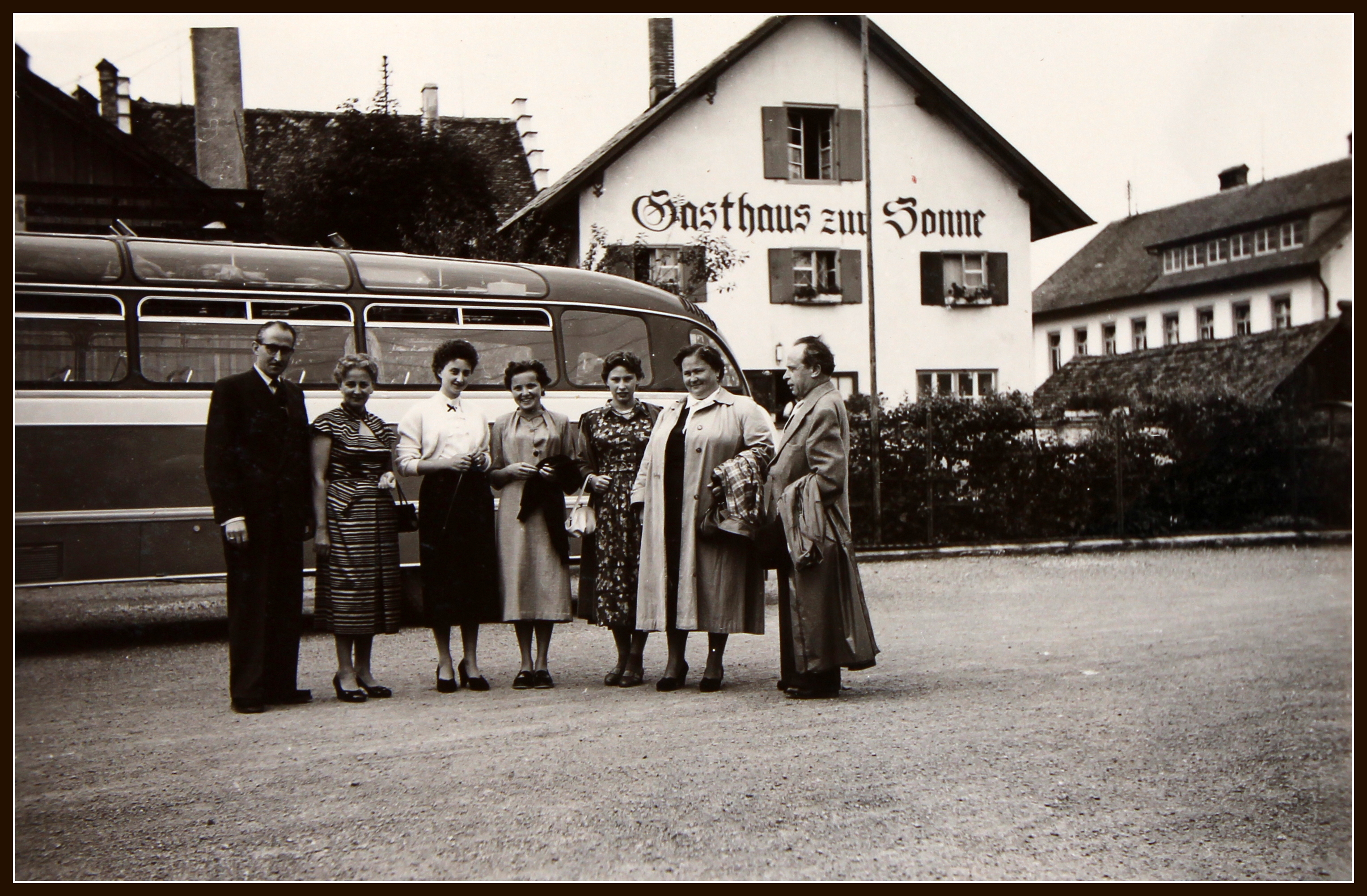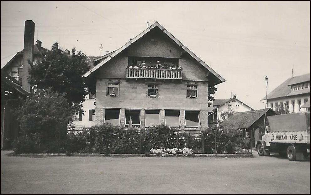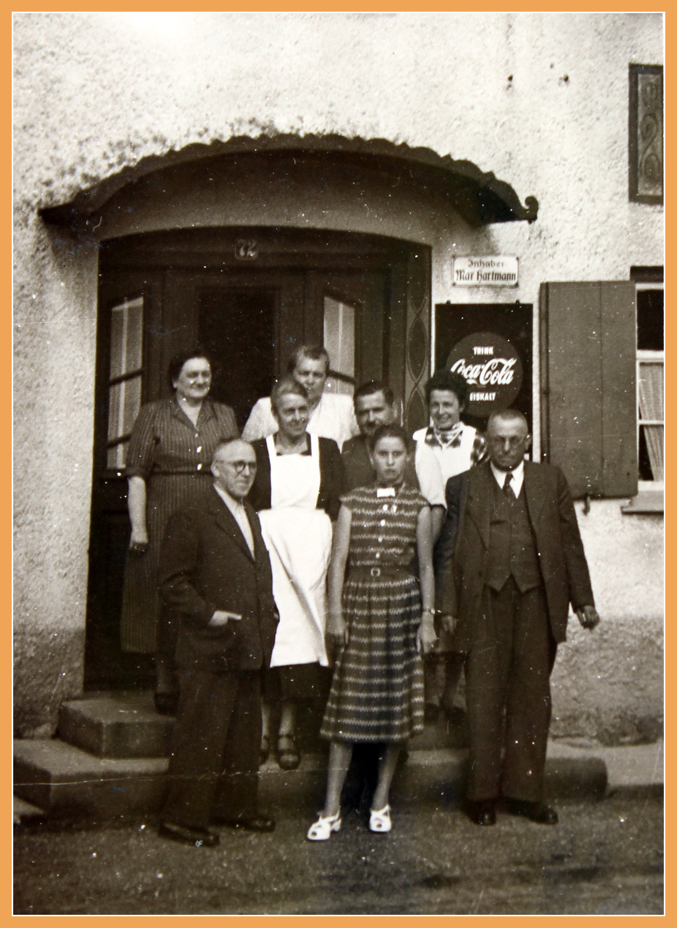 Fotos aus dem Gästebuch der Jahre 1955 und 1956 ,viele Saarländer kamen damals nach Altusried. Zu sehen sind auch die Gastgeber Hartmann ( Wirt und Schmiedemeister ) , seine Frau Justine Hartmann und die beiden Töchter Gusti und Elfriede. - Bild 3. Im Hintergrund die Sennerei, die später zum Rathaus umgebaut wurde. - Bild 4. Justine in der Mitte.