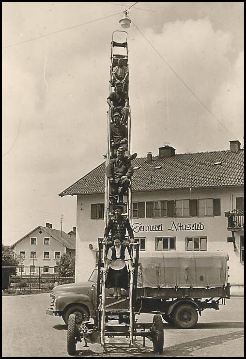 - Sechs Personen auf der Feuerwehrleiter, Gusti unten.