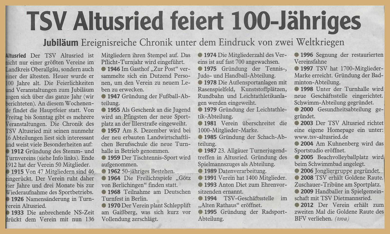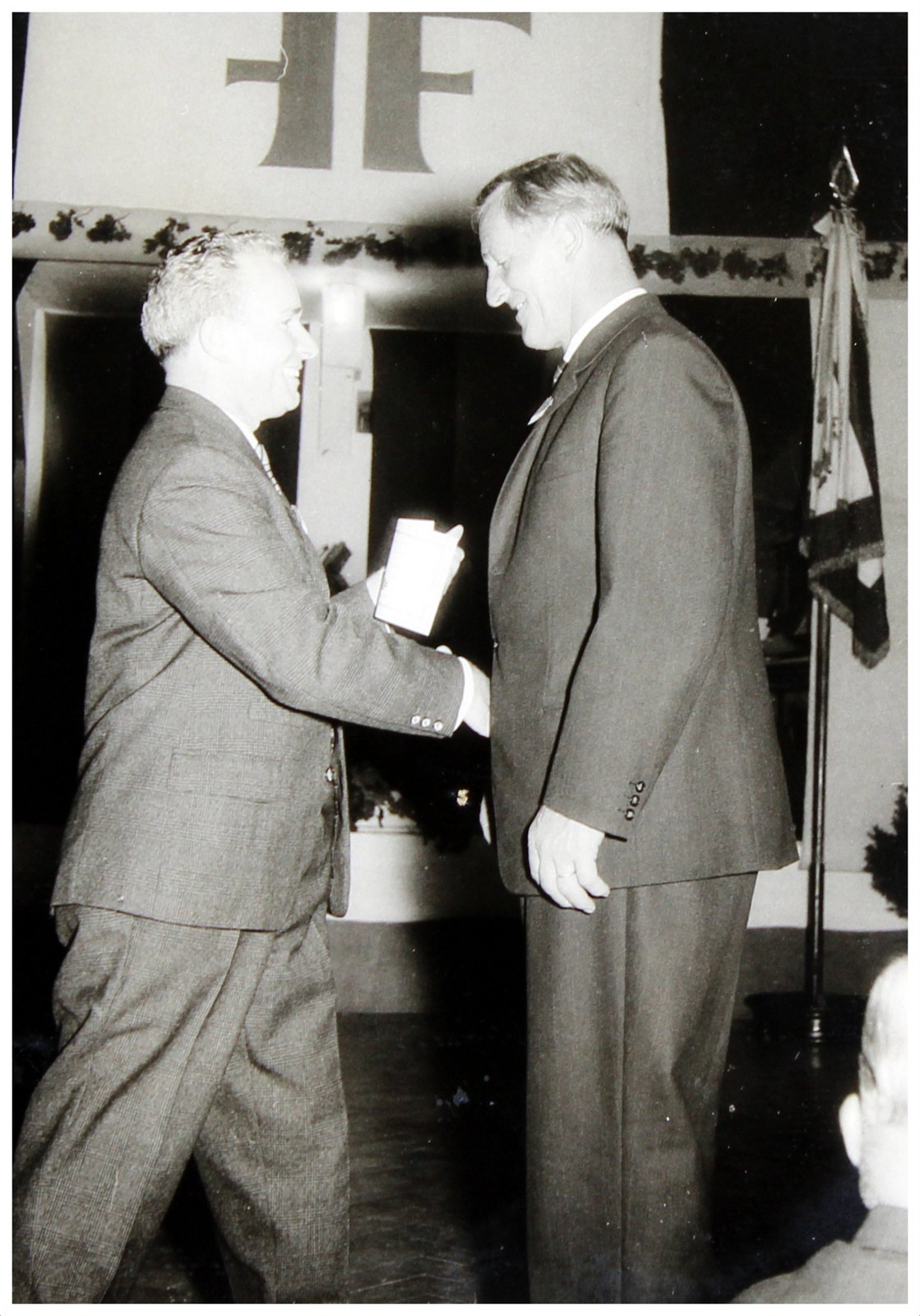 - TSV Vorstand Alois Kellner überreicht dem Ehrenvorstand Botzenhart eine Urkunde. Liste der Vorstände des TSV seit Kriegsende: Botzenhart, Kellner Alois, Baur, Aicher, Diet Xaver, Klüpfel Horst, Klüpfel Peter, Bergmann.
