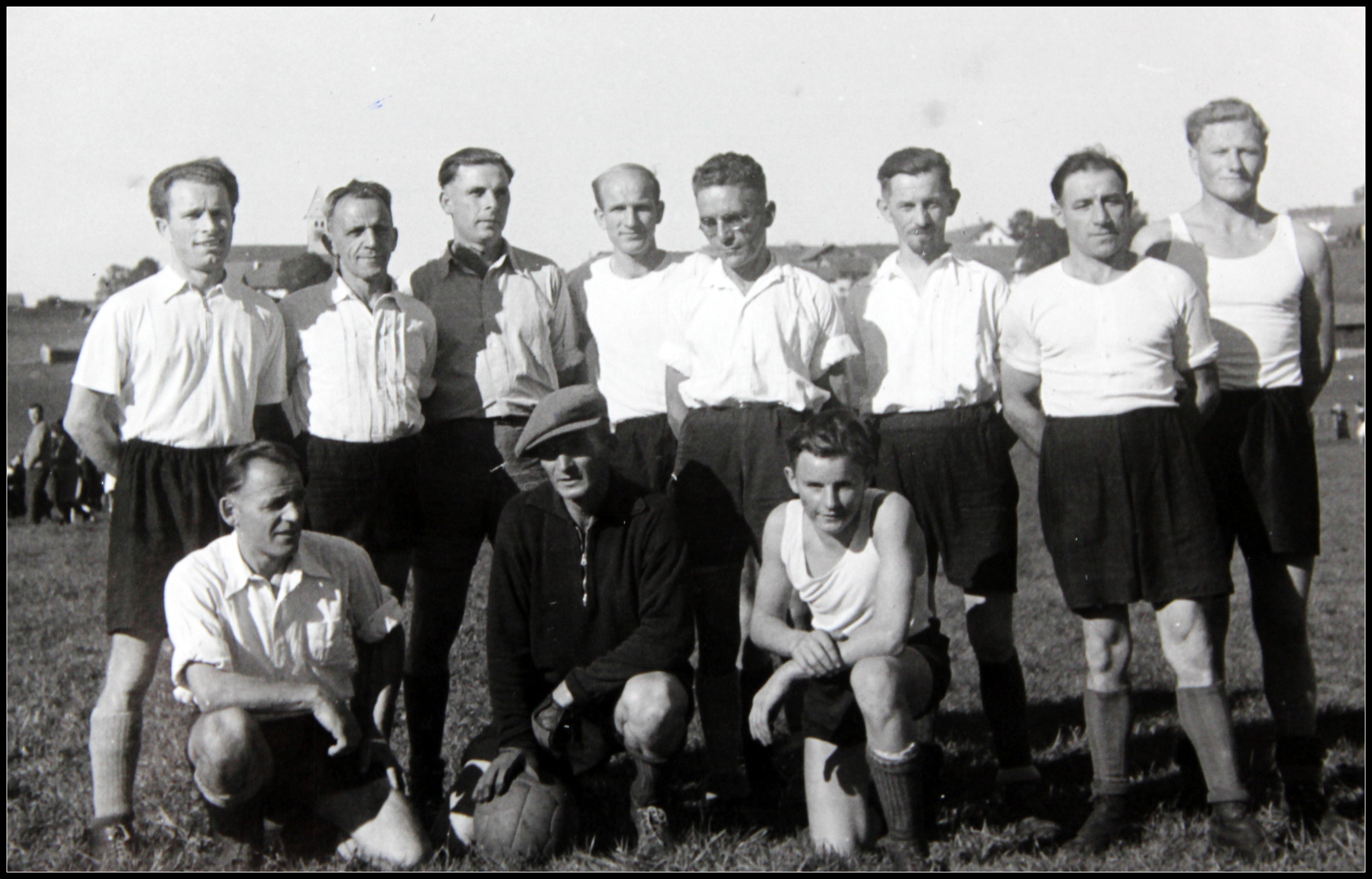 - Elf Spieler mit Ball: Wystrach, Hartmann Rudi, Kellner Richard, Schneider Eugen, Arendt Günther, Wolfgang Max, Gundolf Fritz und andere