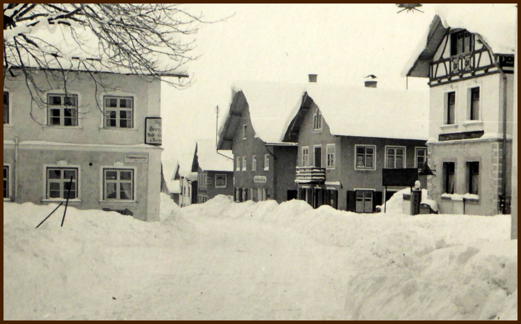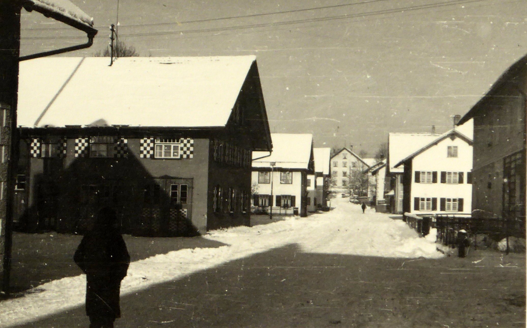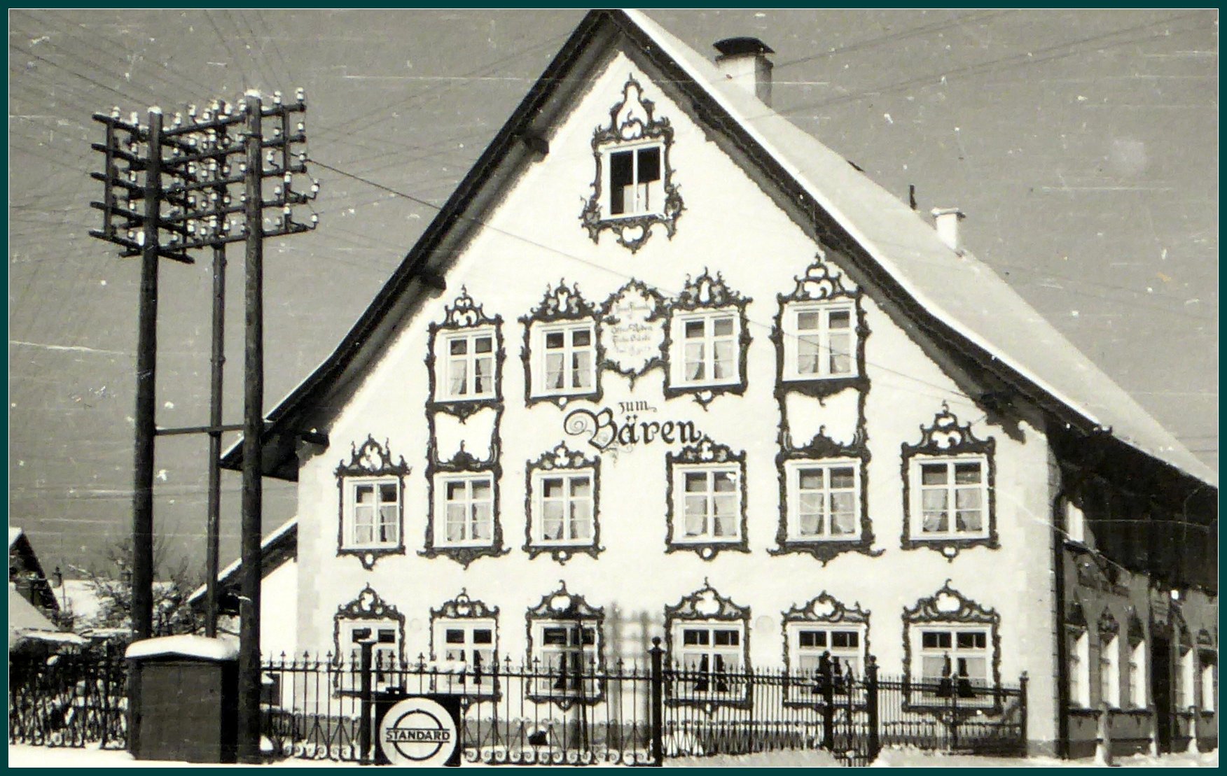 Auch Strom- und Telefonmasten mit den weißen Isolatoren prägten früher das Ortsbild. Maler aus dem Oberbayrischem umrandeten in den Dreißigerjahren die Fenster des Bären im Barockstil.