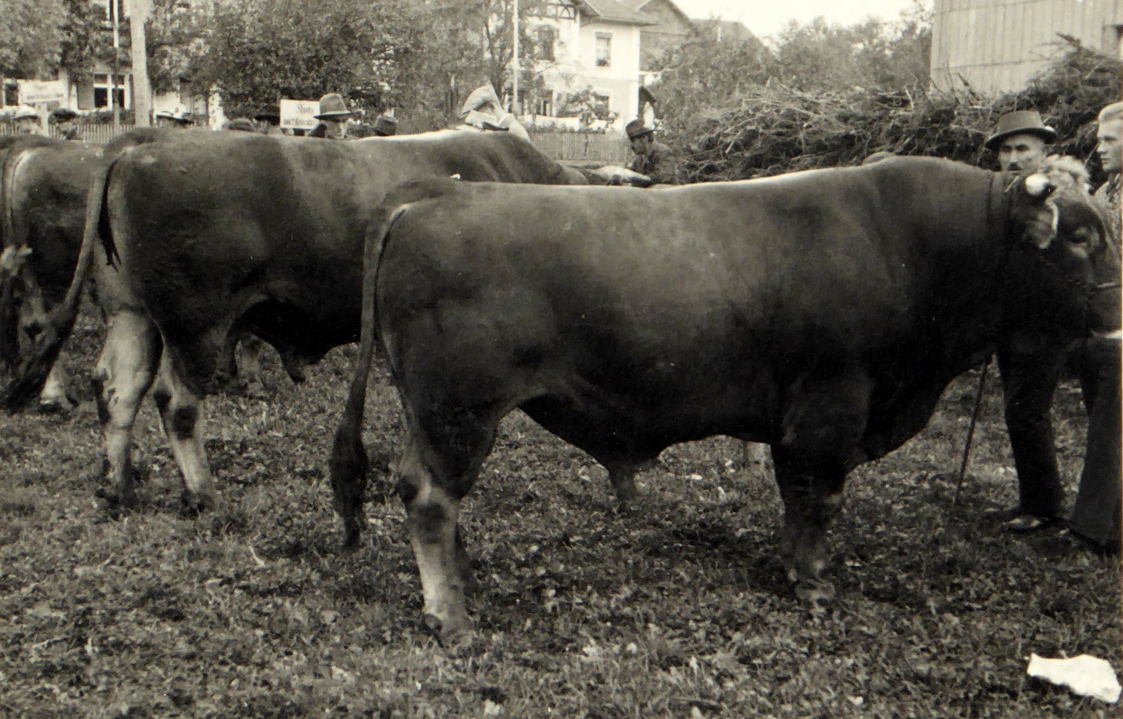 - Rinderschau auf der Wiese. Die Hitlerfahne flattert im Wind.