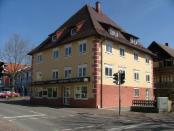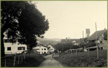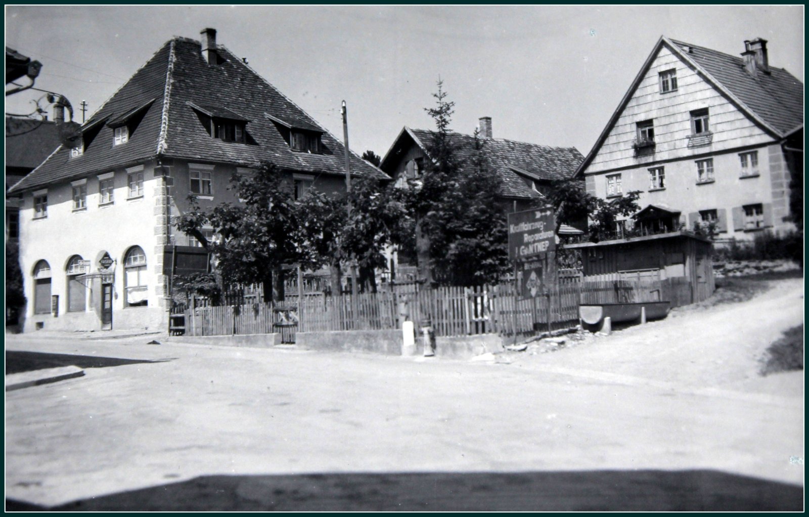 - Links das Rössle, rechts der Biergarten. Ein Schild weist auf die Autowerkstätte Gantner hin.