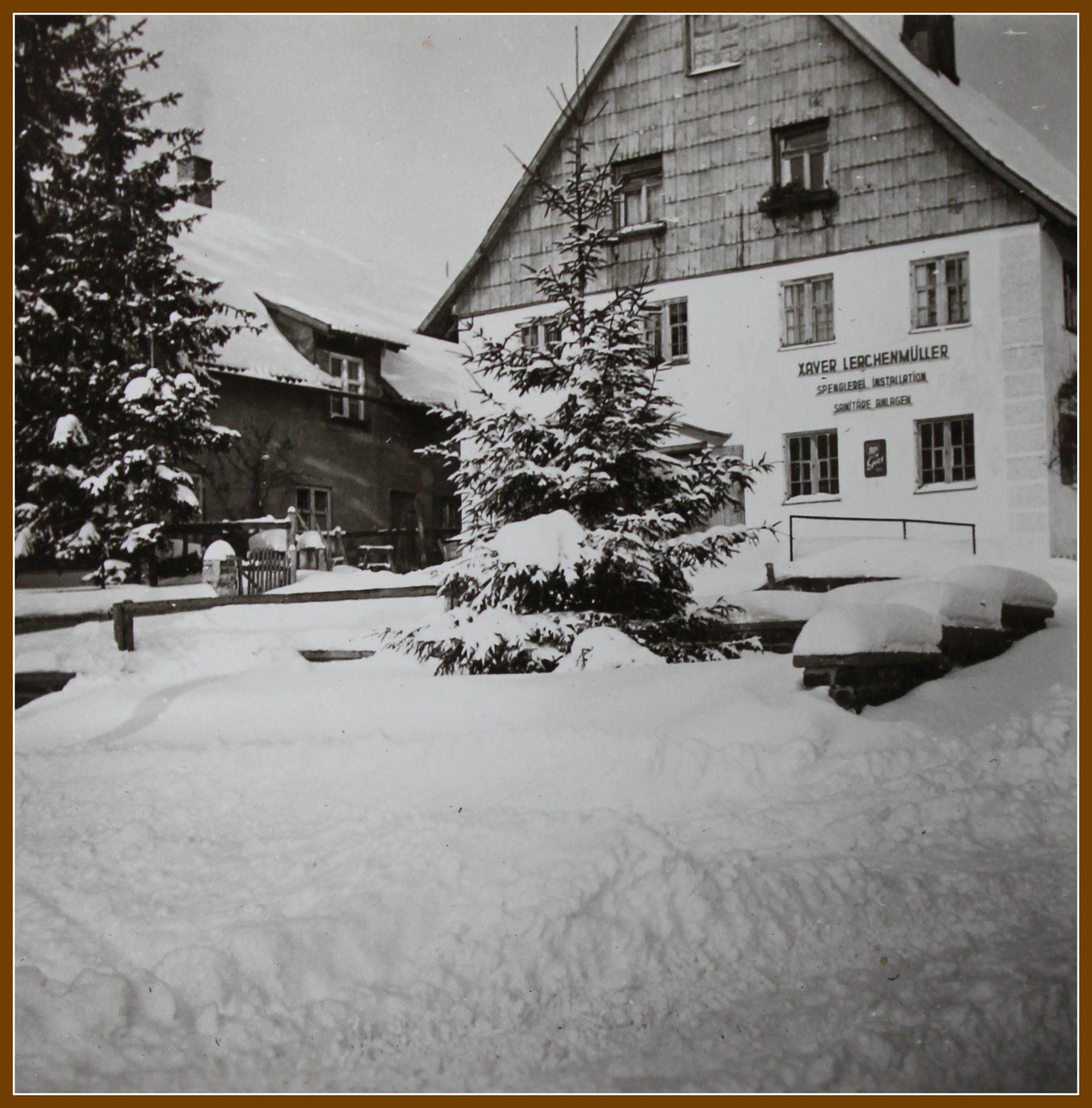 - Auf der Hausfassade steht: Lerchenmüller, Spenglerei, Installation, Sanitäre Anlagen