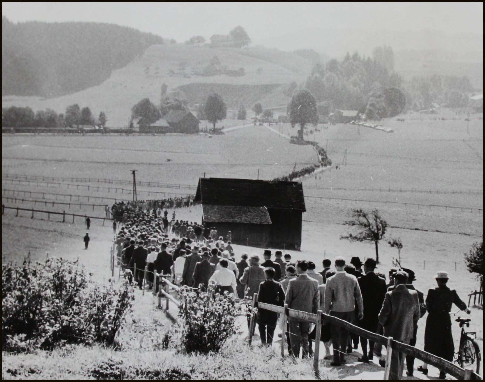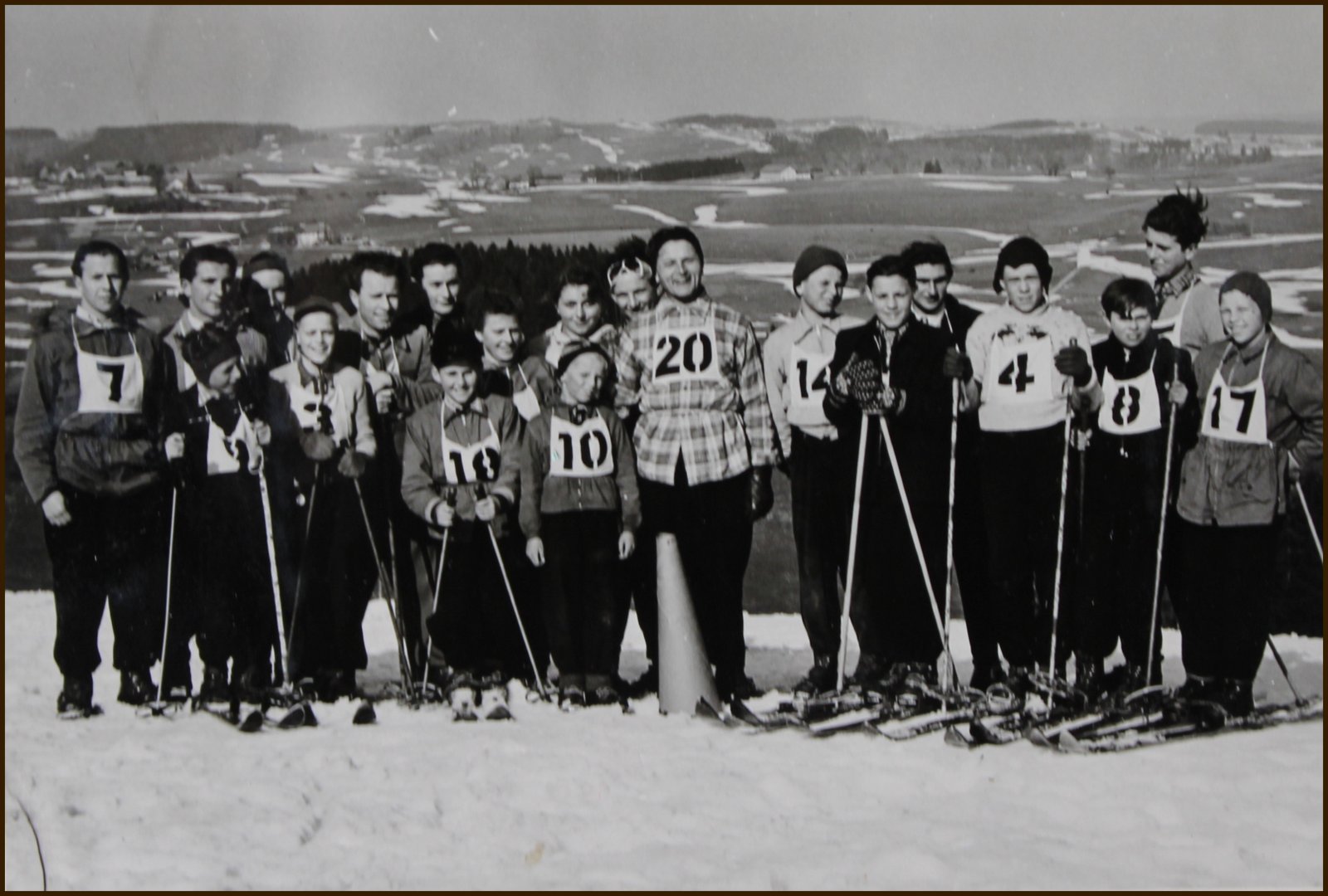 Skiabfahrtslauf des TSV Altusried, anno 1950. Im Hintergrund das Illertal.Ganz links mit der Nummer 7 Ohneberg Max, in der Mitte Würzner Franz Abteilungsleiter mit der Nummer 20.