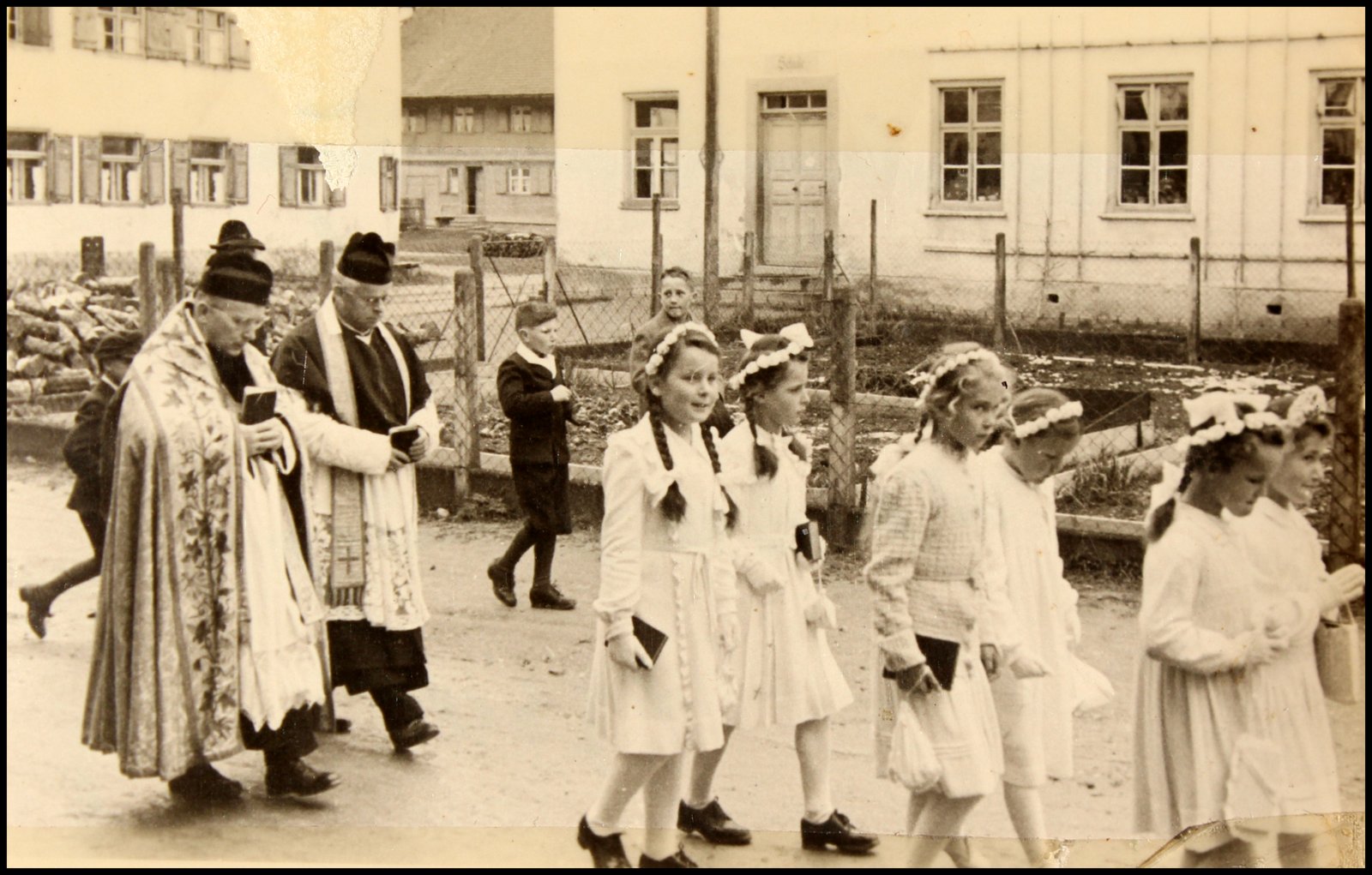 Der Primizzug von Briechle führt vorbei am Gasthaus Ochsenreiter und dem Gemischtwarengeschäft Reisacher. Primiziant Briechle trat in den Benediktinerorden St. Ottilien ein. Er nannte sich dann Pater Urban.