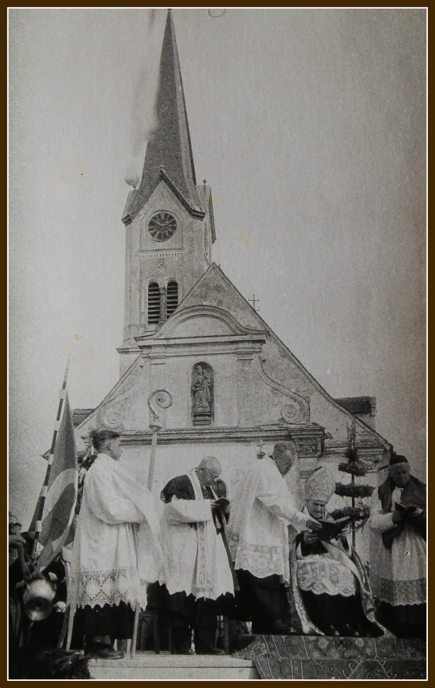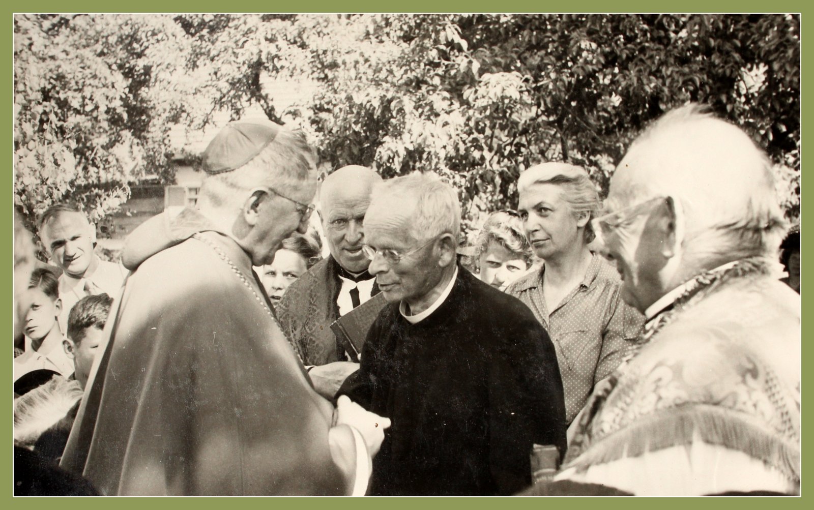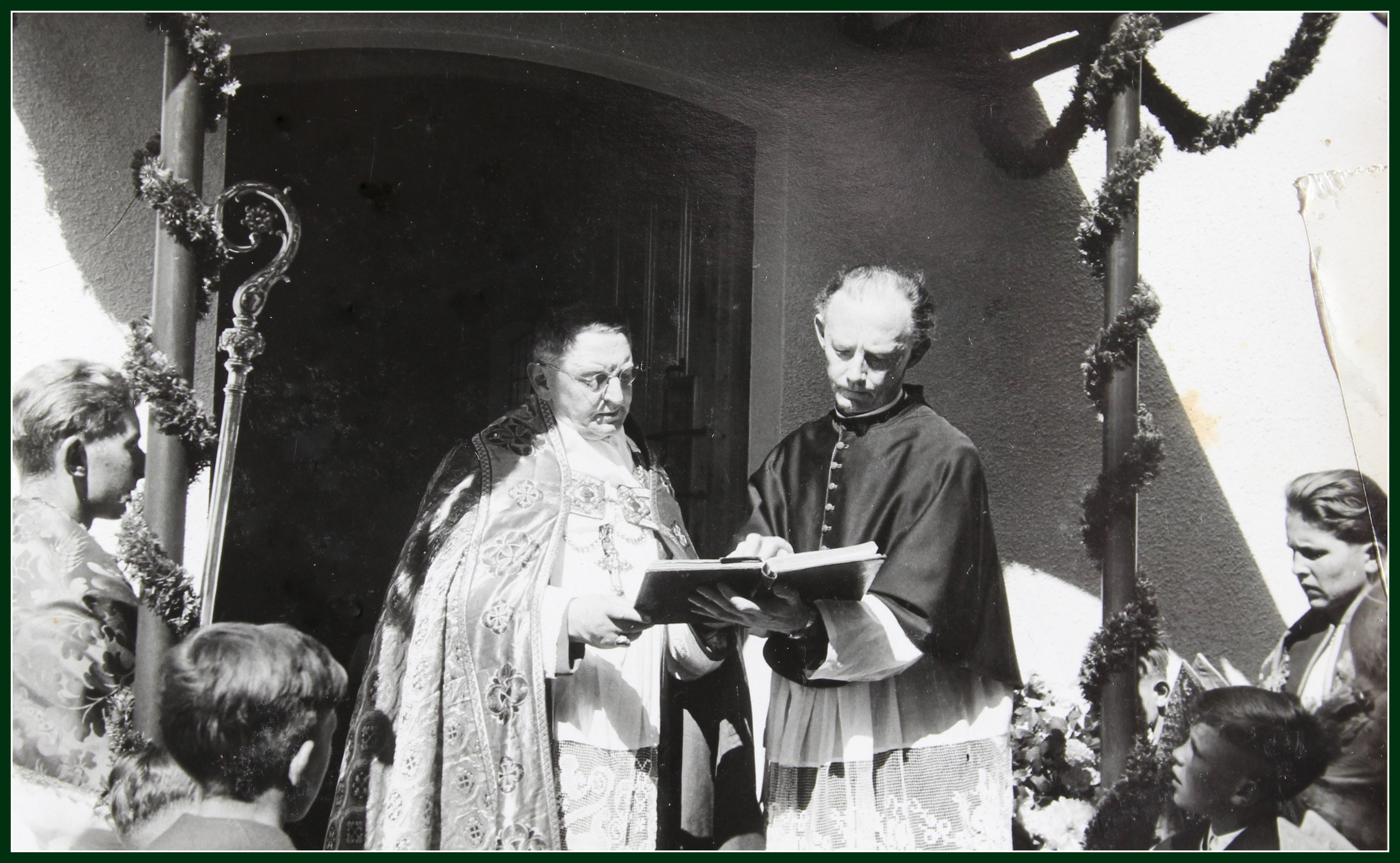 Von links nach rechts: Berger Hanni, Vertreter der Diozöse, Hegele Robert, Krug Franz, Schindele Hermann, Haggenmiller Joseph, Pfarrer Adolf Renftle, Pfarrer Felber, Boreck Franz, Schönmetzler Stefan
