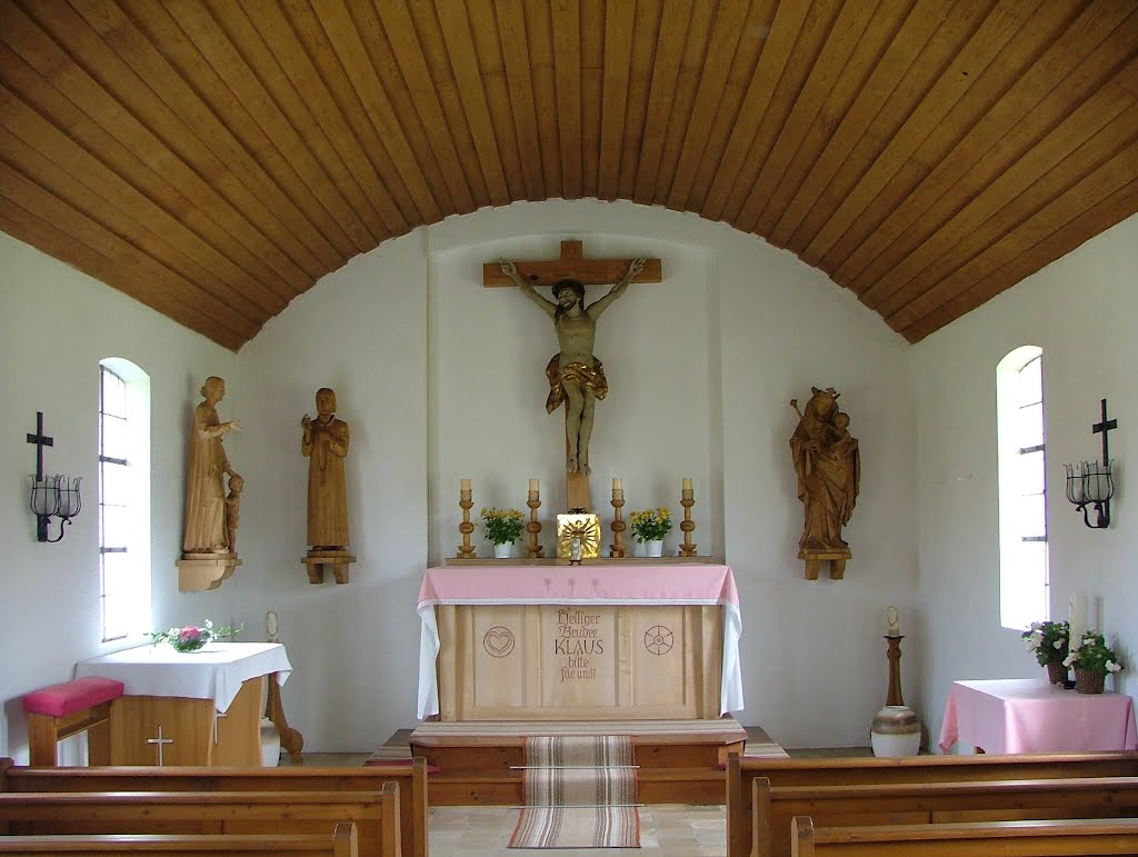 - Ganz vorne nahe dem Hochaltar war früher die Komunionbank. In der Mitte konnte man sie öffnen. Doch nach der Liturgiereform war sie nicht mehr notwendig und wurde entfernt. Außerdem gab es noch zehn kleine Kniebänke für die Kinder. Links die Mädchen, rechts die Buben.