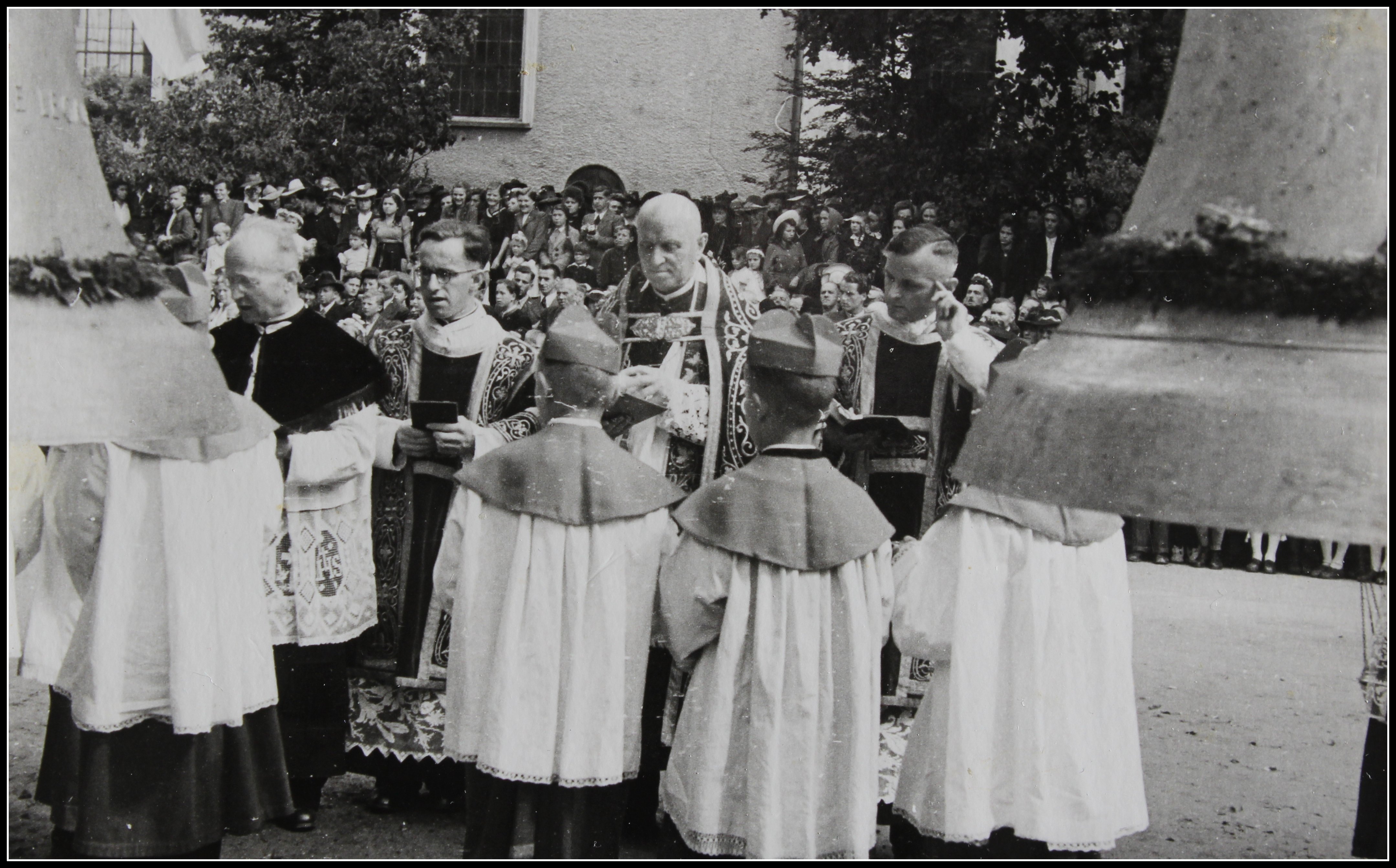 Im Krieg wurden fast alle Glocken beschlagnahmt und eingeschmolzen. Die Bronze brauchte man für Kanonen. Sieben Jahre nach dem Krieg konnte man sich wieder neue Glocken leisten. Feierlich wurden die neuen Glocken eingeweiht. Der Zelebrant war Abt Maria Einsiedler von Ottobeuren.