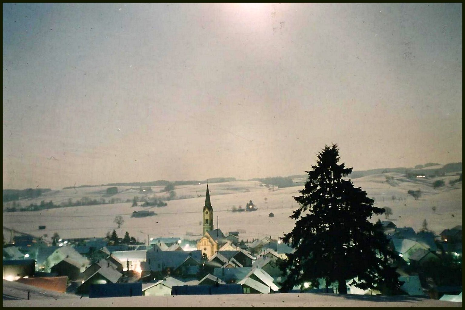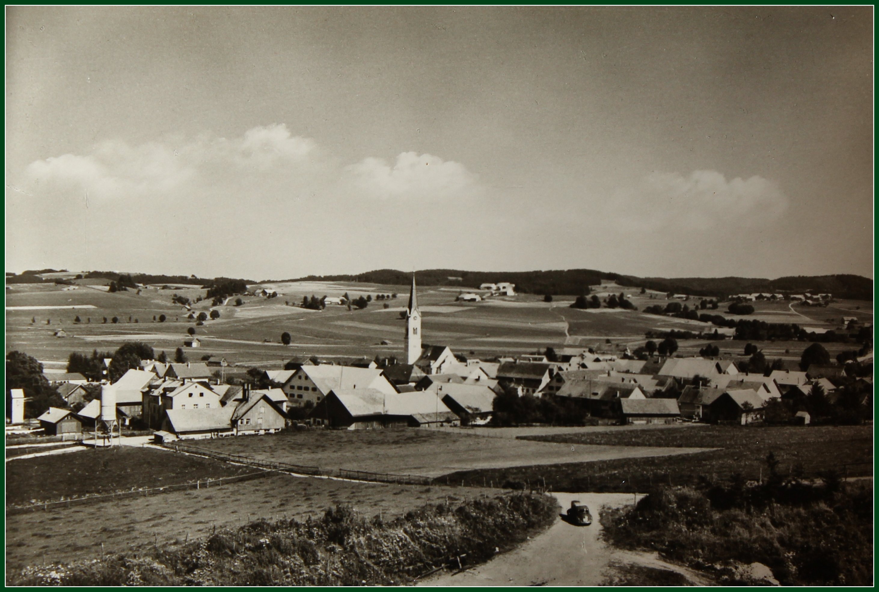 Blick vom Vogelsberg auf Frauenzell. Auf der Zufahrt zur Kiesgrube parkt ein VW Käfer.