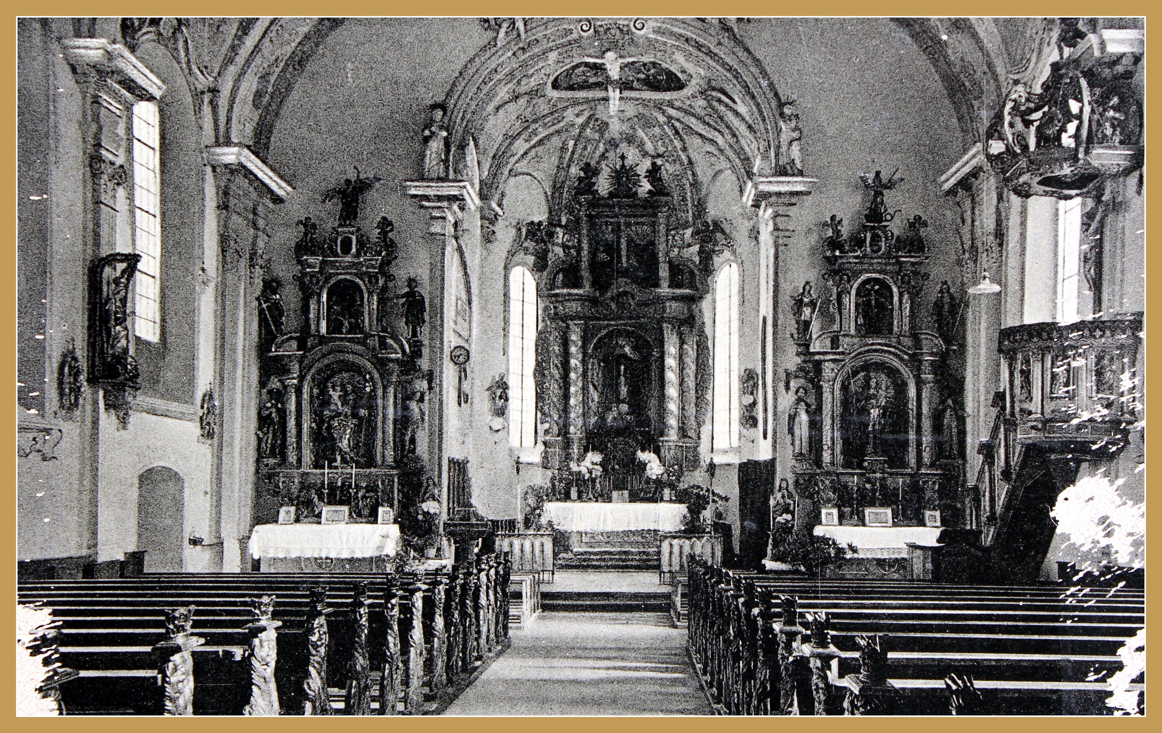 Ein altes Bild von der Kirche. Im Chor eine Uhr. Sie zeigt 8 Uhr 35 . Am Übergang zum Chor hing damals an der Decke noch ein großes Kreuz.