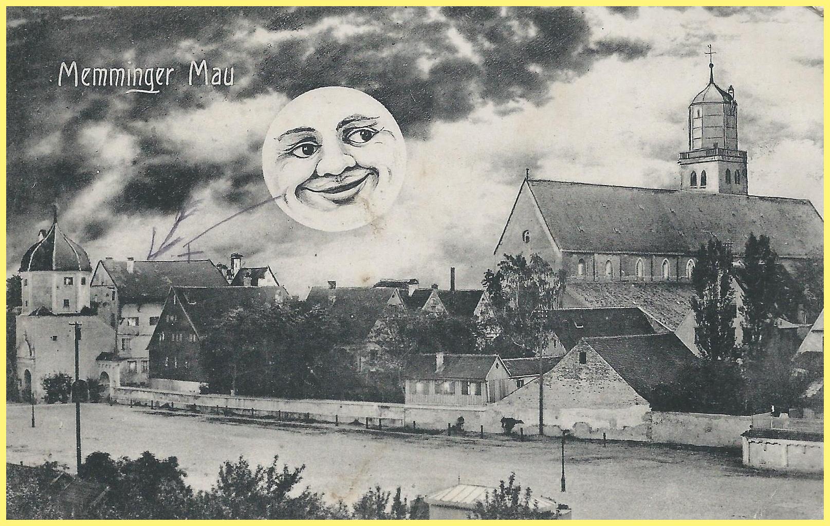 Memminger Mau. Die bekannteste Memminger Sage handelt vom Memminger Mau." In einer klaren Vollmondnacht gingen ein paar Memminger heimwärts. Da sahen sie wie sich der Mond in einem großen Zuber spiegelte. Da kam plötzlich einem der Gedanke .................".