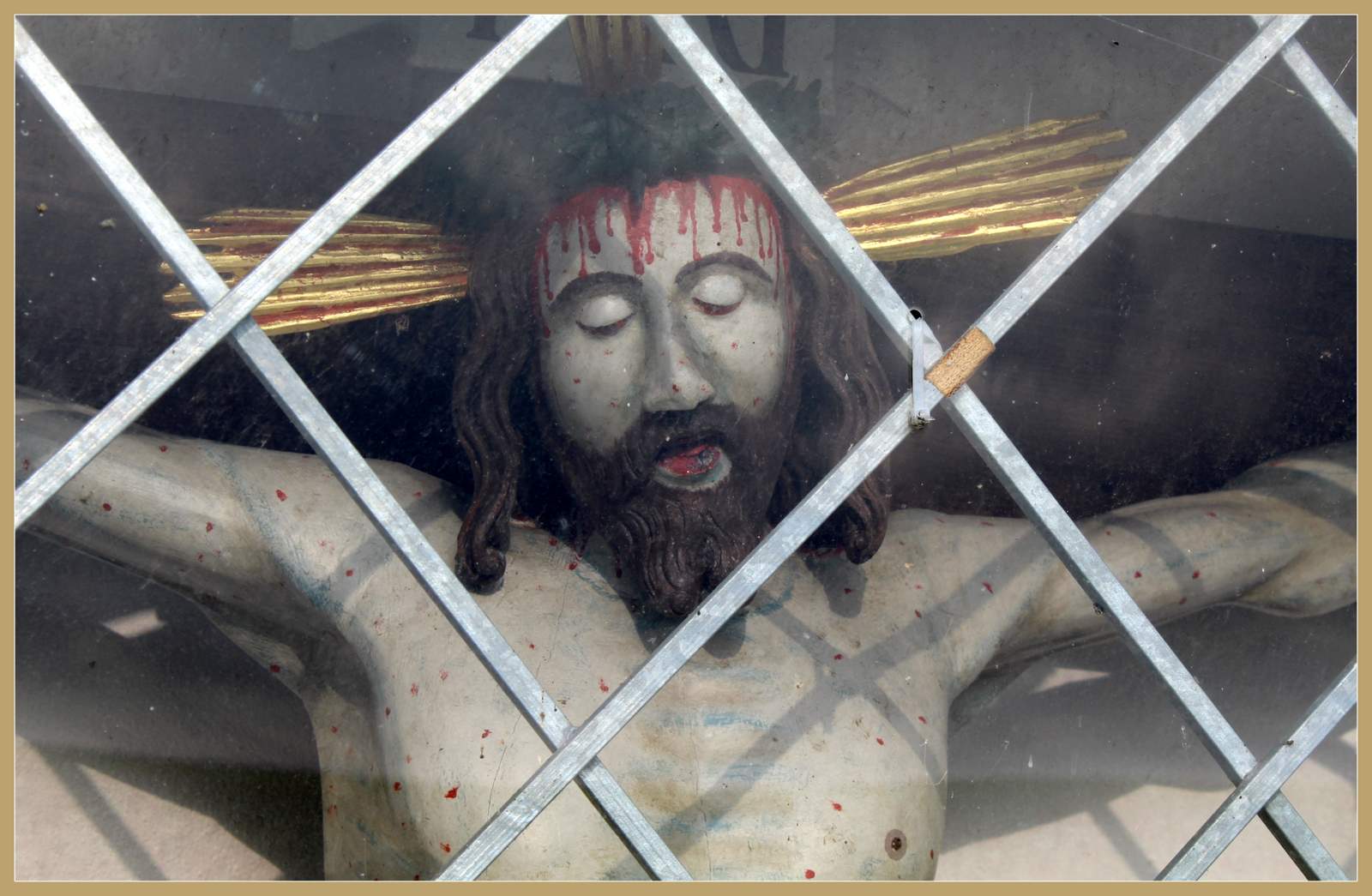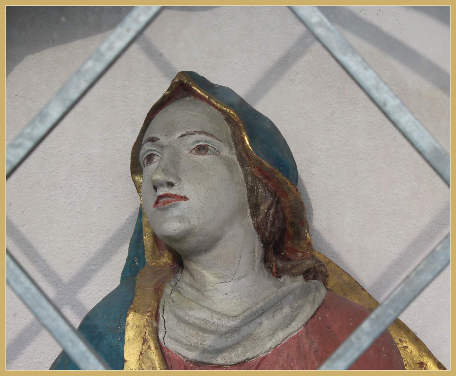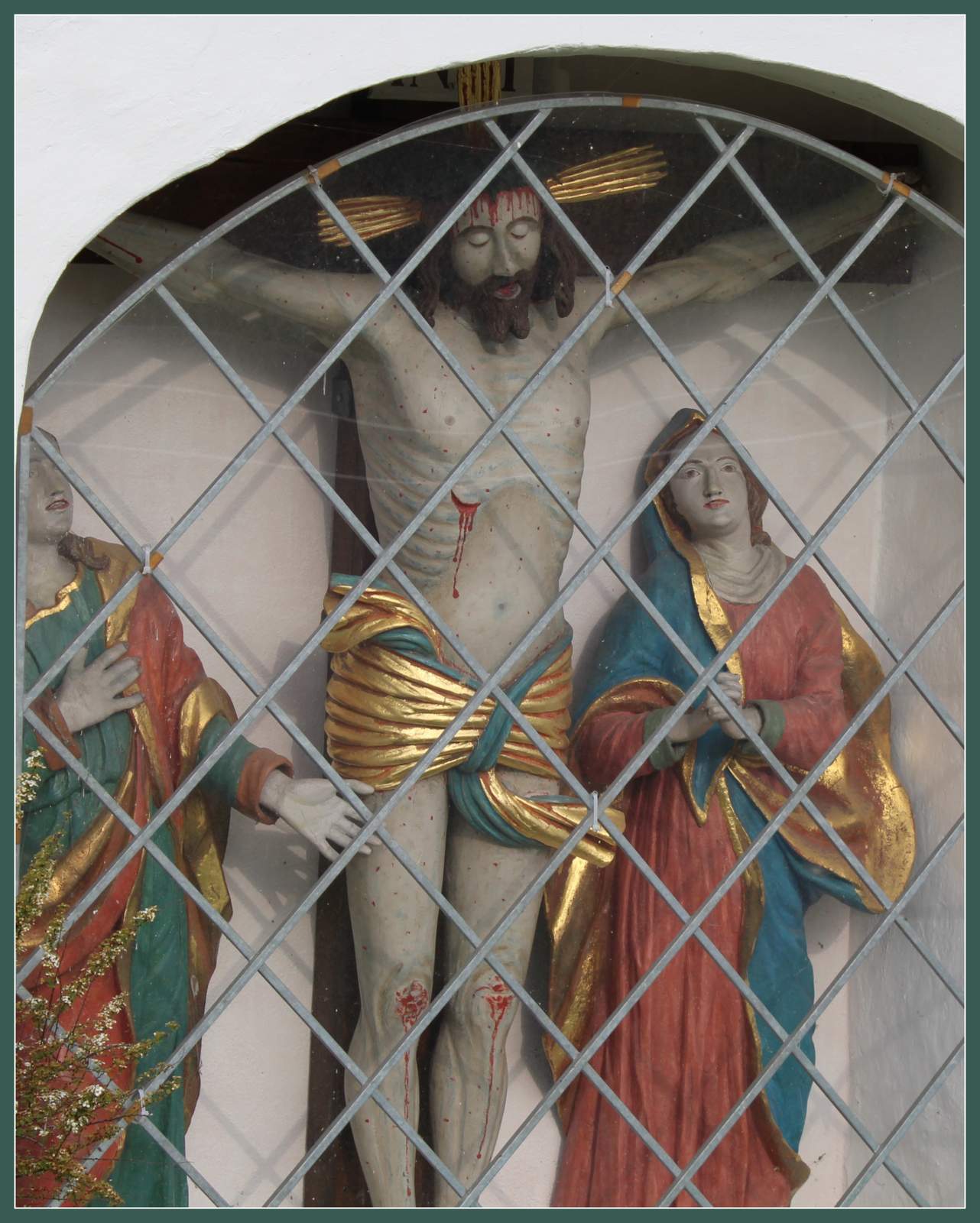 Maria unter dem Kreuz. Am Bildstock wurde zur Scherheit ein Gitter angebracht.