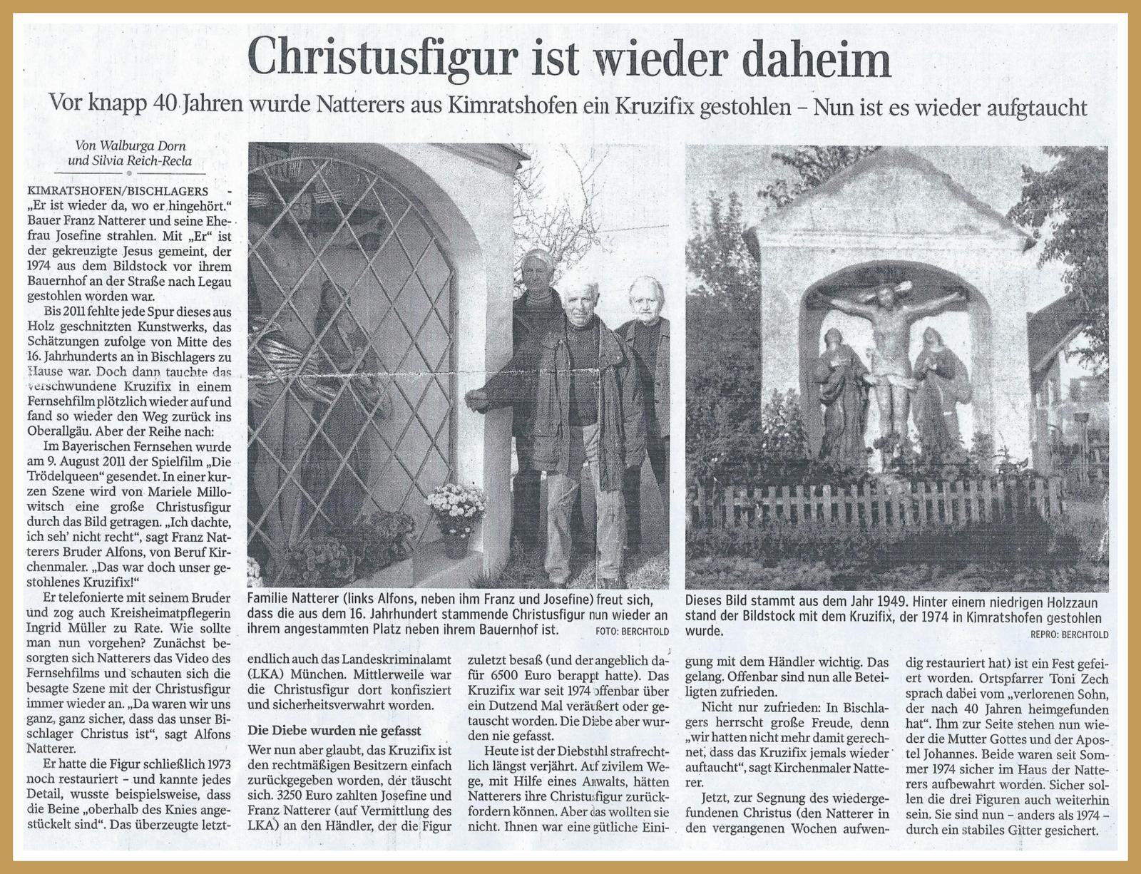Die Christusfigur in Bischlagers wird entwendet und bleibt 37 Jahre verschollen. Doch am 9. August 2011 wird im bayerischen Fernsehen der Spielfilm " Die Trödelqueen " gesendet.In einer kurzen Szene wird von Mariele Millowitsch eine große Christusfigur durch das Bild getragen. Ich dachte, ich seh nicht recht, sagte Alfons Natterer, von Beruf Kirchenmaler. Das war doch unser gestohlenes Kruzifix.