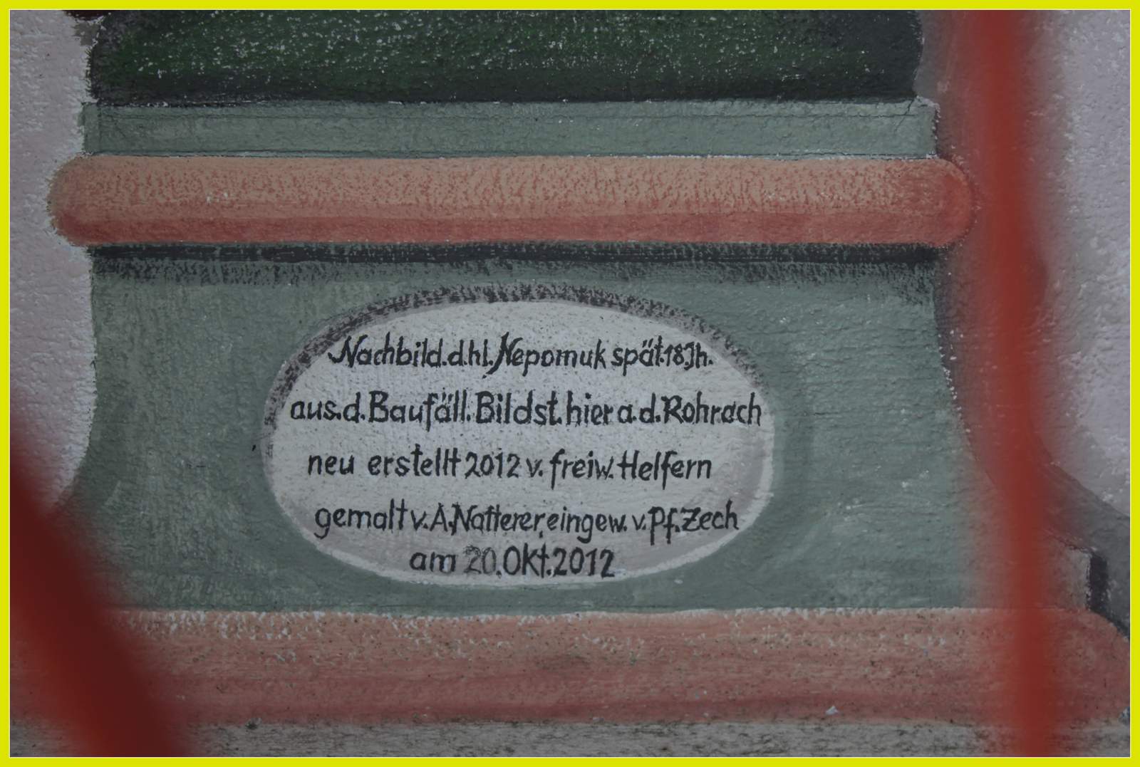 Nachbild. d. hl. Nepomuk spät. 18. Jh. aus d. Baumfäll. Bildst. hier an der Rohrrach neu erstellt v. freiw. Helfern, gemalt v. A. Natterer. eingew. v. Pf.Zech am 20. Okt. 2012