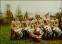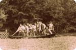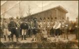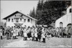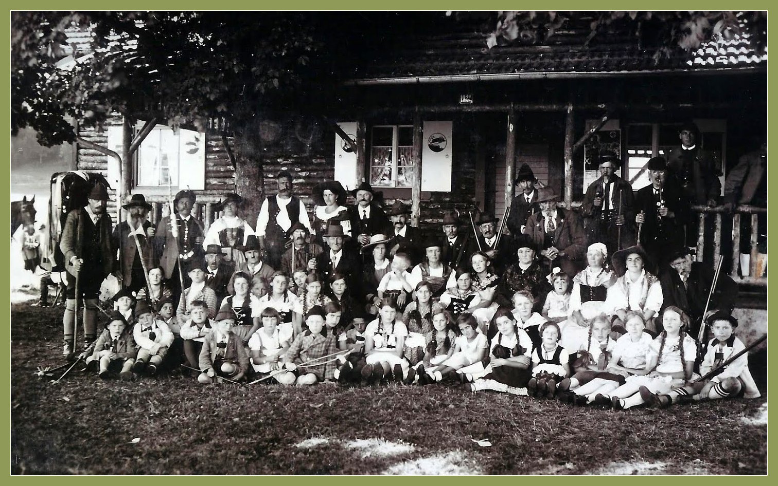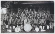 - Spielerhütte mit Musikanten auf den Höllwiesen. Dritte Reihe von unten, erster von links, August Reffler.