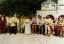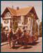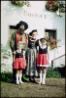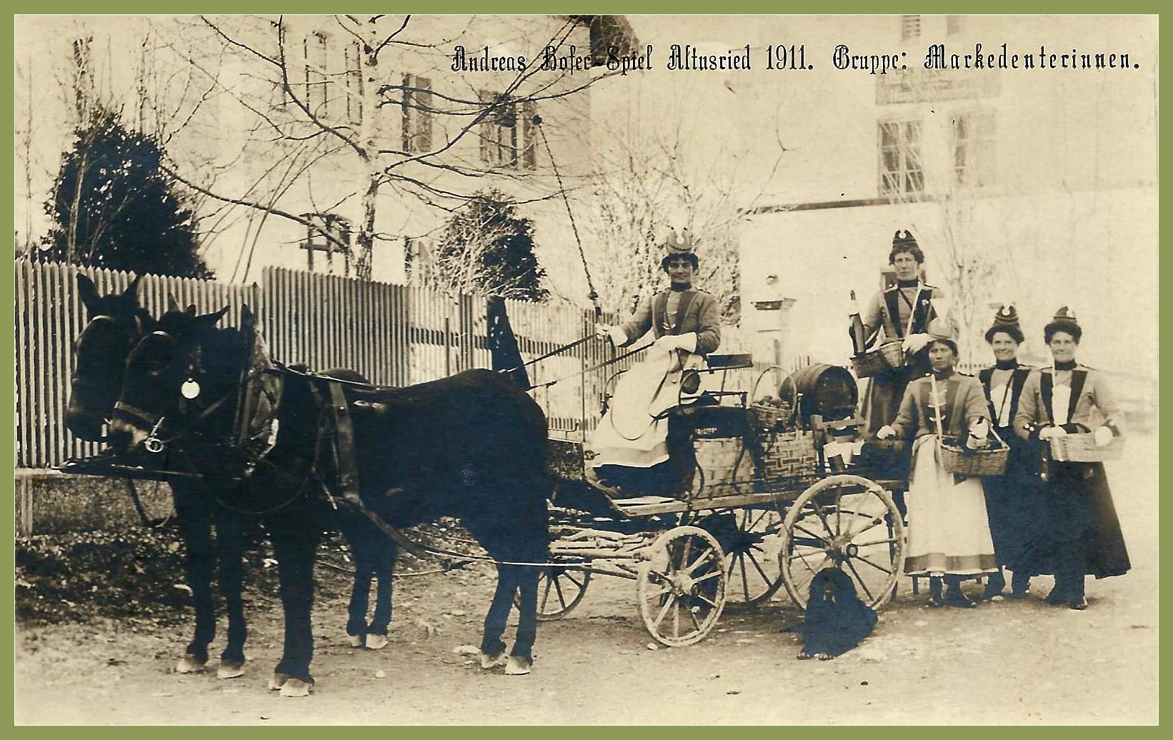 1911 Andreas Hofer - Spiel Gruppe Marcketenderinnen, links das alte Pfarrhaus, rechts die alte Schule, bzw. Pfarrheim