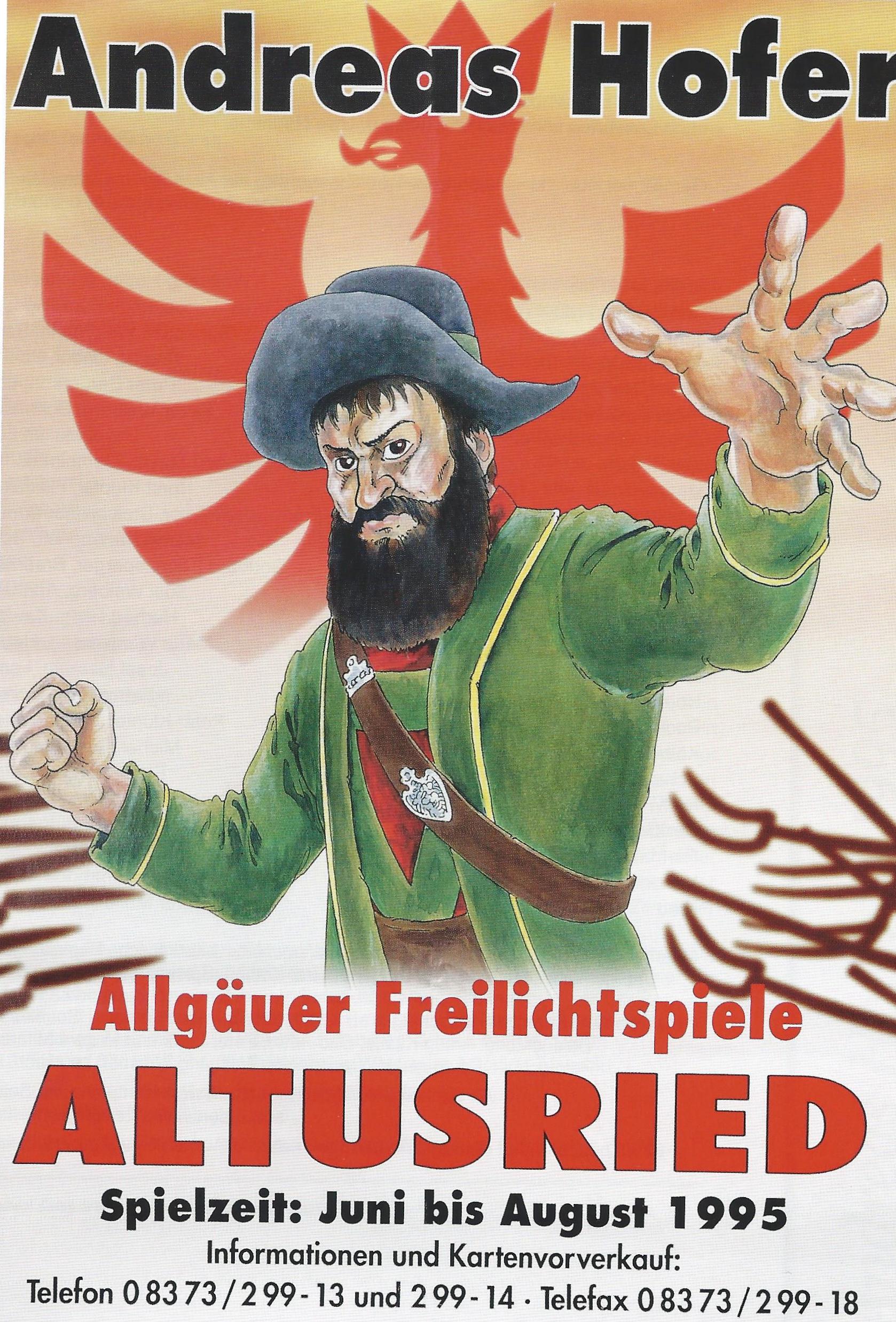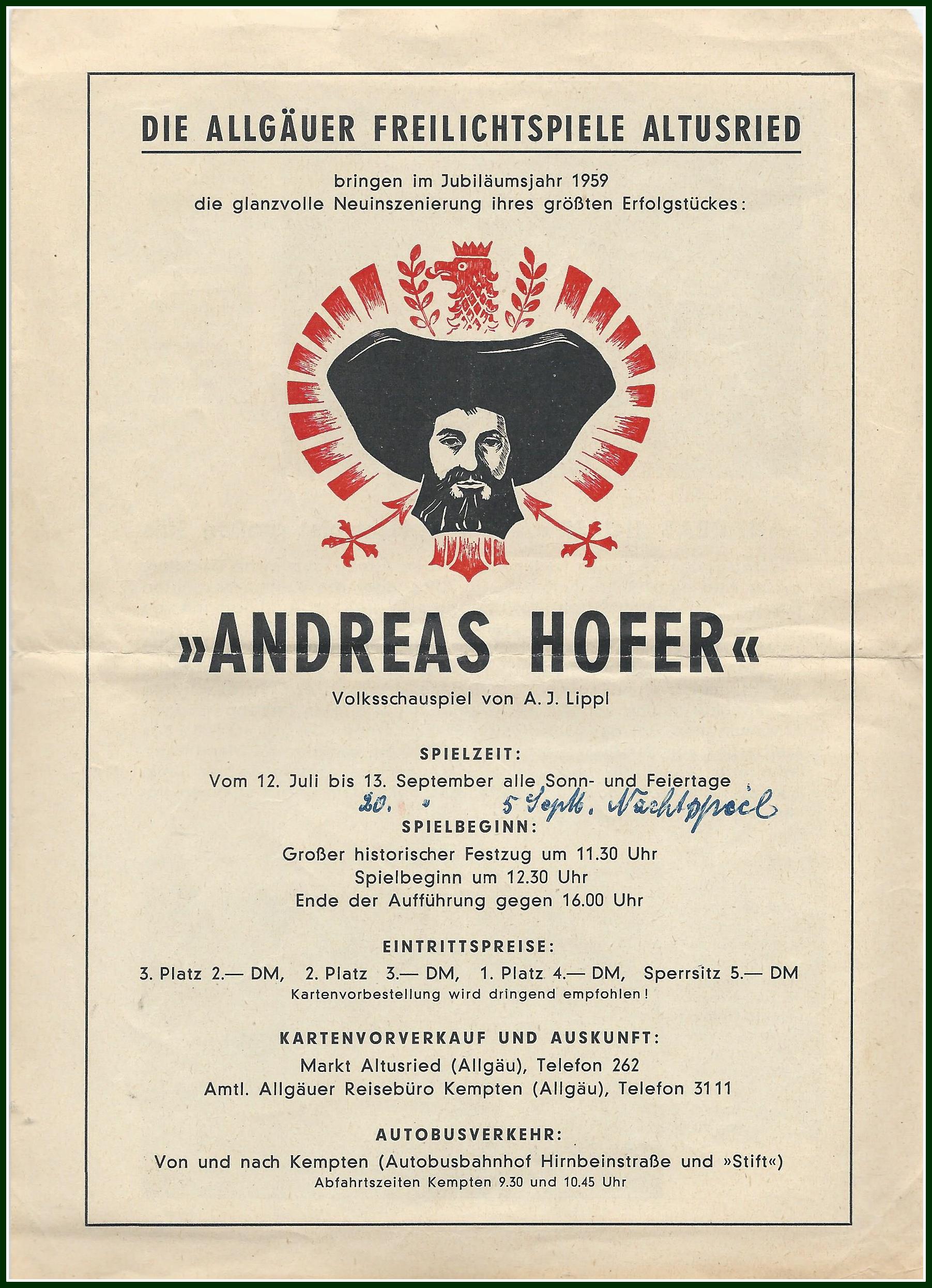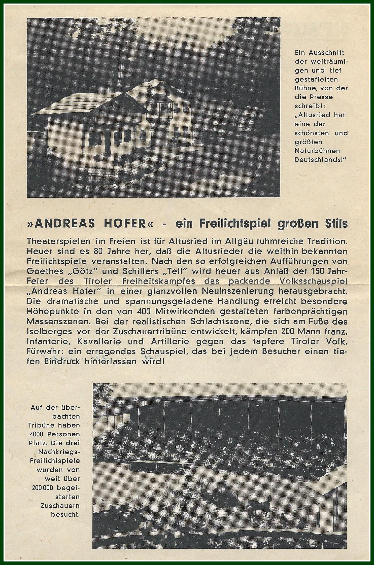 Unter den Altusrieder Freilichtspielen ist das Stück von Andreas Hofer am beliebtesten. Es hat Spannung und Tragik und ist ideal für eine Aufführung unter freiem Himmel. Damals spielte man nicht im Riedbachtobel sondern auf den Höllwiesen. Im Hintergrund das Rauhanwesen. Es steht weit und breit allein.