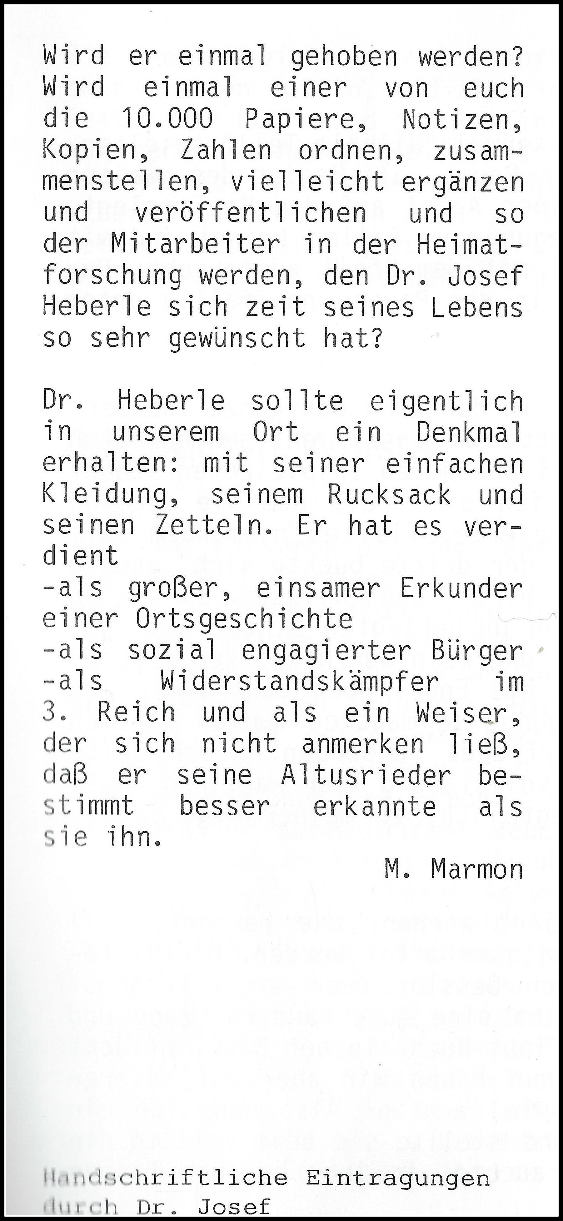 Ein Haus von dem nichts übrig blieb, ist das Schlössle von Altusried. Anno 1953 besteht es noch. Dr. Joseph Heberle beschreibt es und erzählt seine Geschichte im Wochenblatt Nr.19 von 1953. Es stand neben dem Kaufhaus Brändle, etwas zurückgesetzt. Beide Gebäude wurden beseitigt zugunsten eines Neubaus. So ist der Heberleartikel nur noch ein Nachgesang von dem, was einst war. Was noch von Dr. Joseph Heberle blieb, sind die im Blättle abgedruckten Forschungen, die Erinnerungen an ihn und sein Fahrrad. Georg Heberle hat es aufgehoben.
