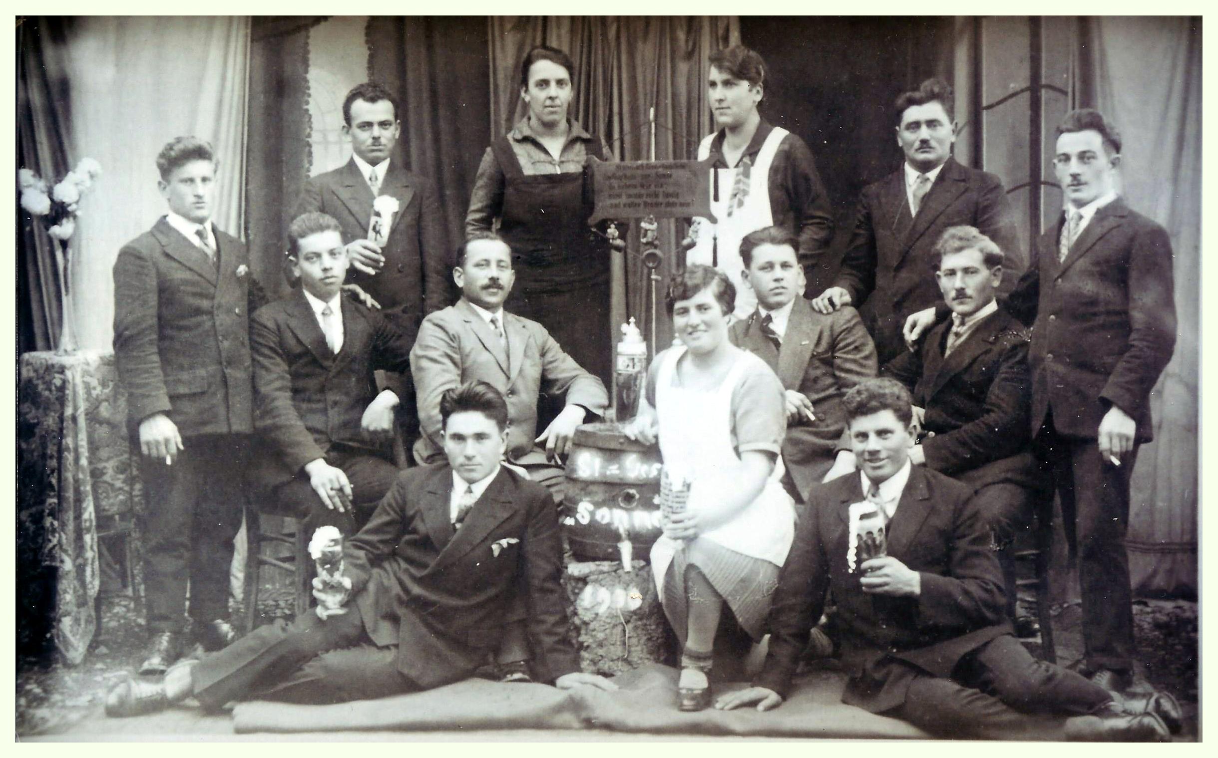 Bekannt ist, das Foto entstand im Photo Atelier Clemens Berger Kempten-Altusried. Die Kleidung von Lehrer und Schüler hat einen etwas militärischen Schnitt, es ist wohl die Zeit des 1. Weltkrieges. Vermutung: Eine Altusrieder Klasse hat sich vor dem Rössle Gasthaus aufgestellt. Rechts ein landwirtschaftliches Gebäude vom Rössle.
