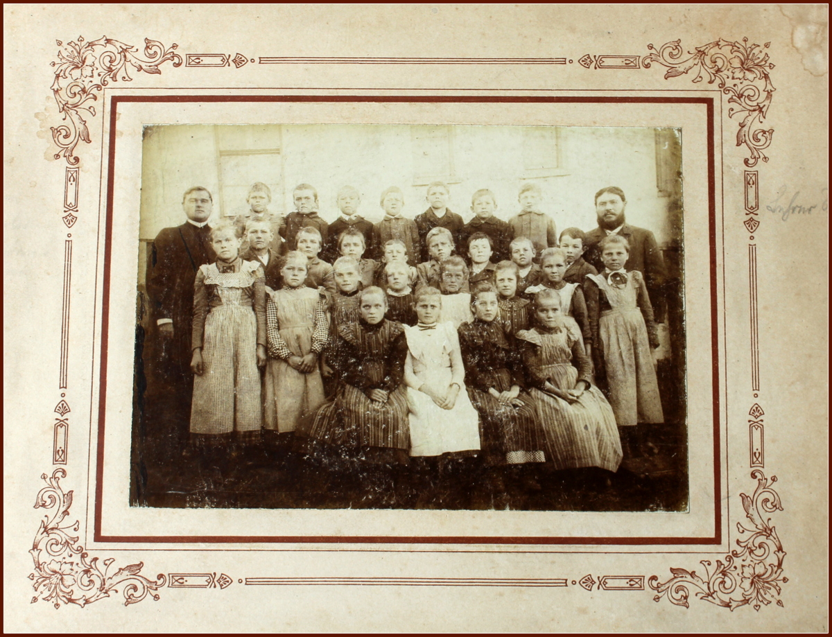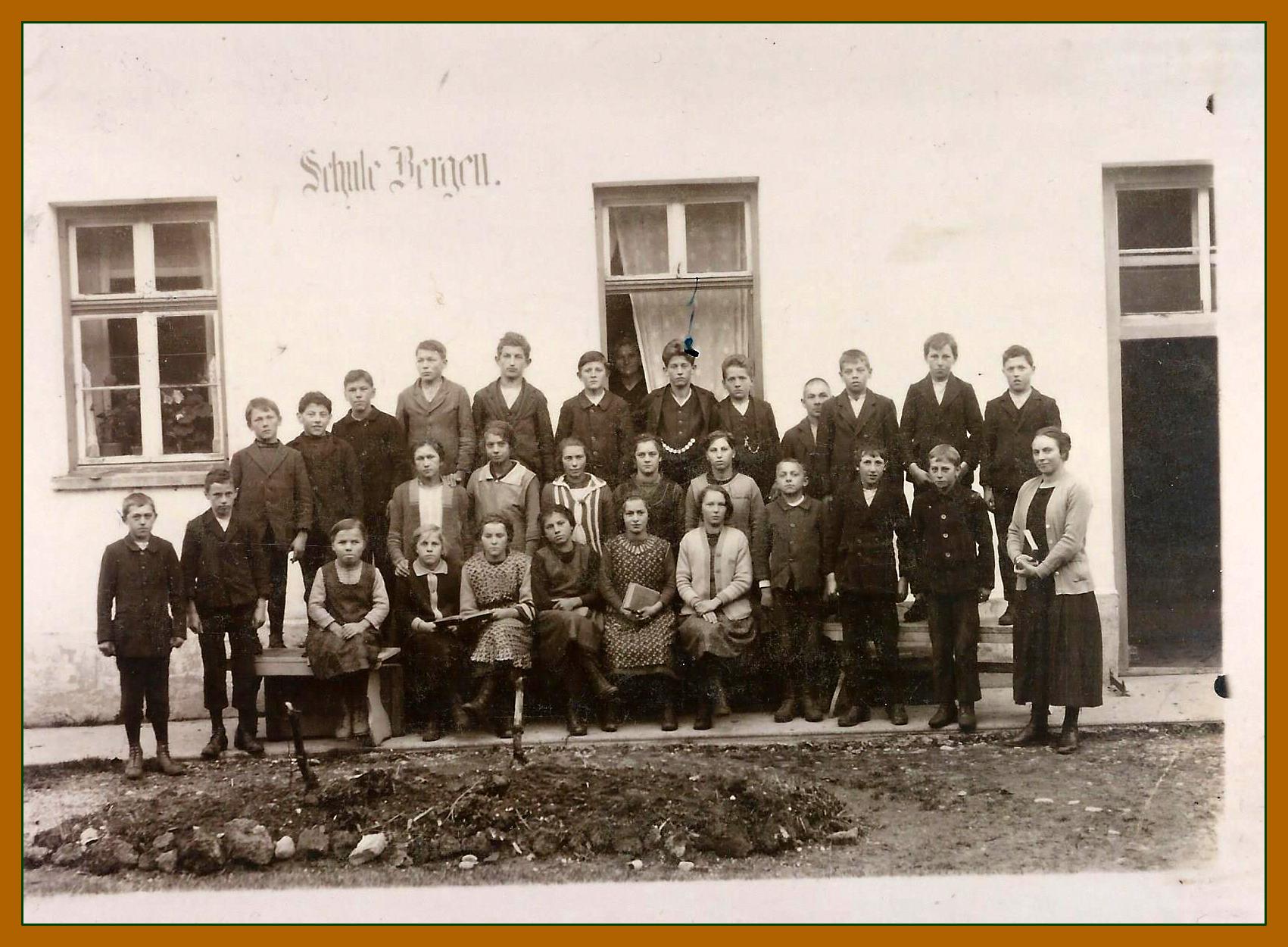 Die Oberklasse der Schule Bergen mit dem 5., 6. und 7. Jahrgang ist hier abgebildet. Damals dauerte die Schulpflicht nur sieben Jahre. Zwischen Pfarrer und Lehrer steht die Schülerschar still. Der Lehrer ist Hauptlehrer L. Mayer, der Vater von Viktoria Mayer.