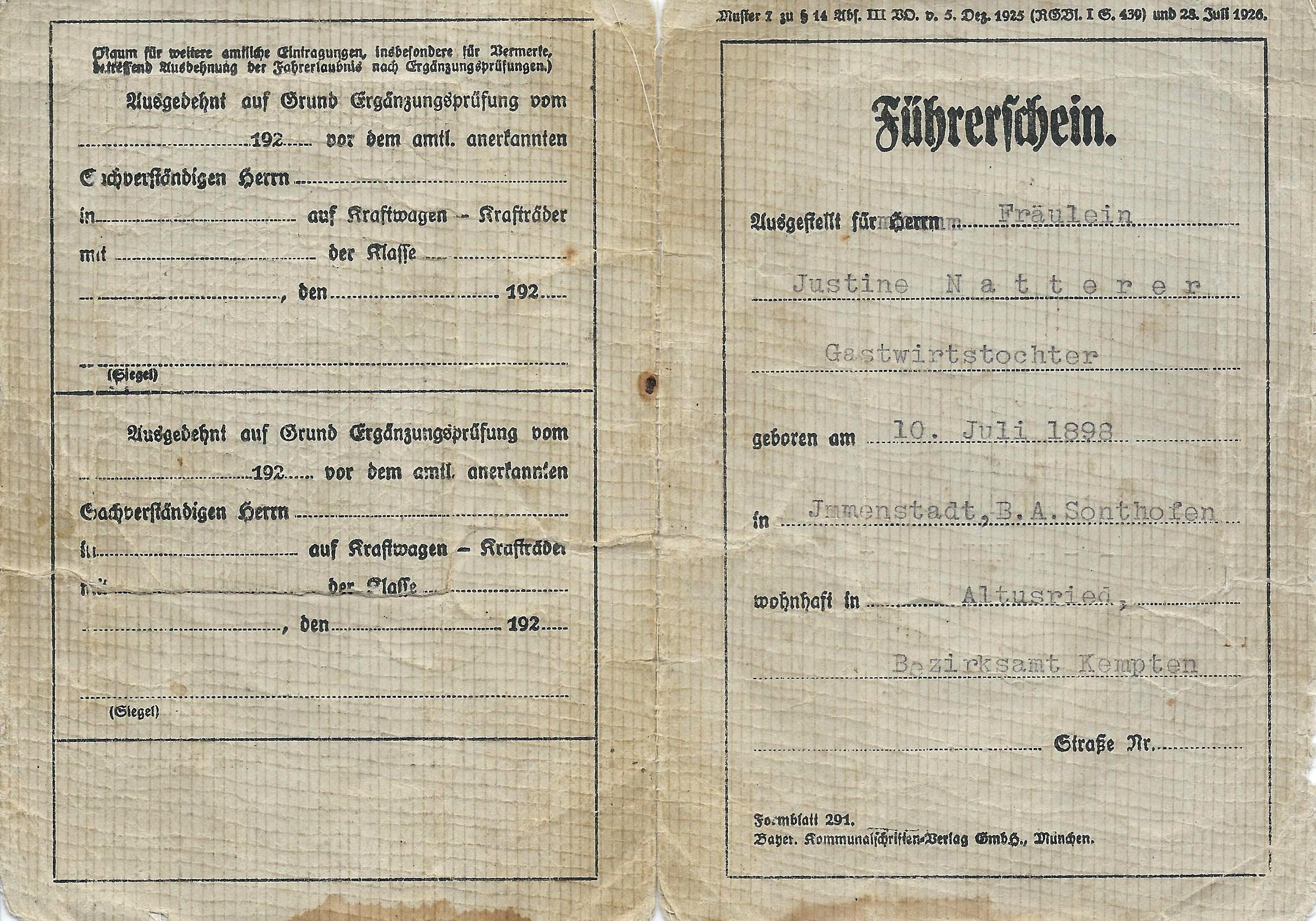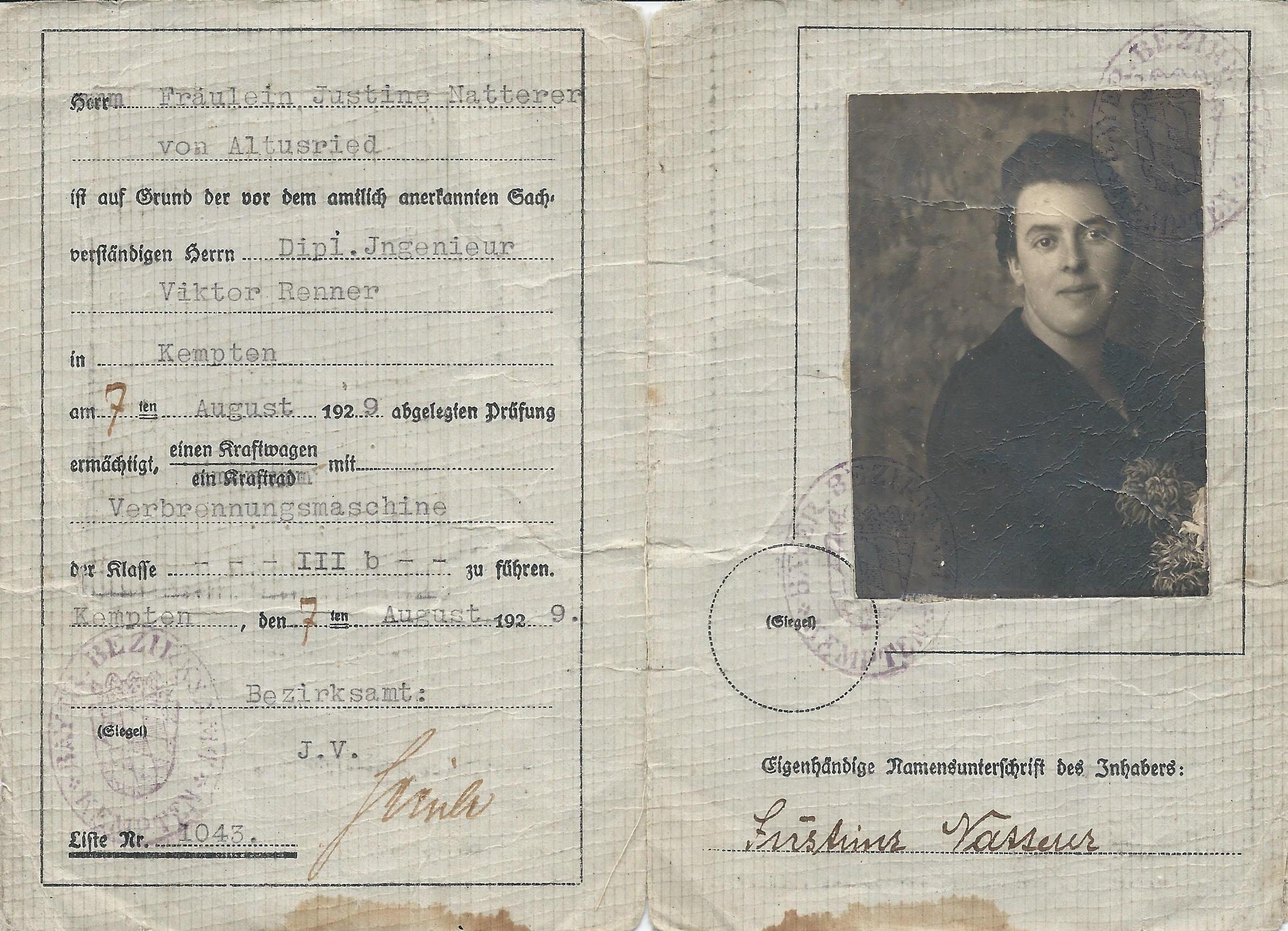 Als erste Frau in Altusried wurde Fräulein Justine Natterer am 7. August 1929 ermächtigt einen Kraftwagen mit Verbrennungsmaschine zu führen