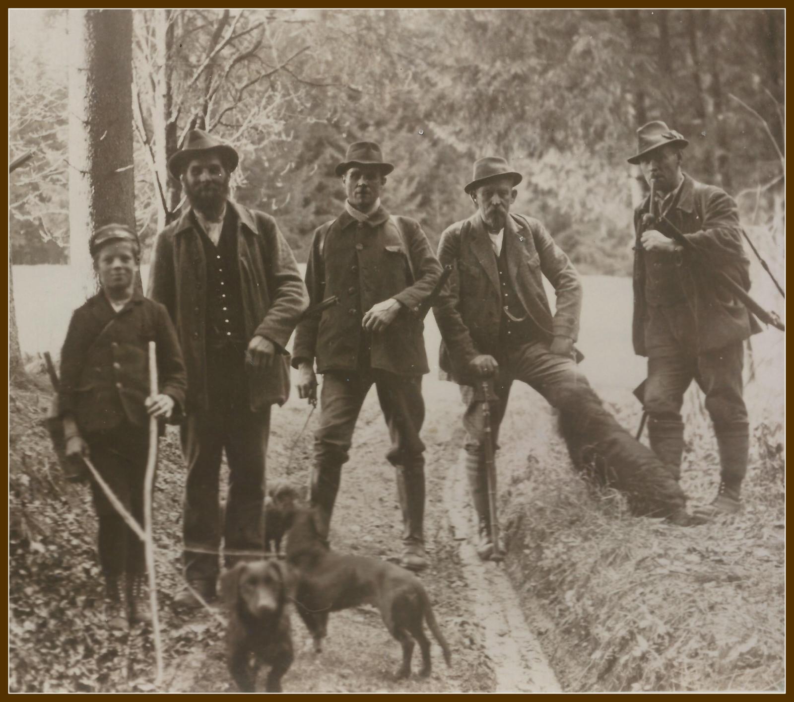 6. Auf der Jagd: Treiber mit 2 Hunden, Innozenz Kreuzer, Johann Kreuzer Bäckermeister, Morent Gastwirt, Johann Gromer Landwirt