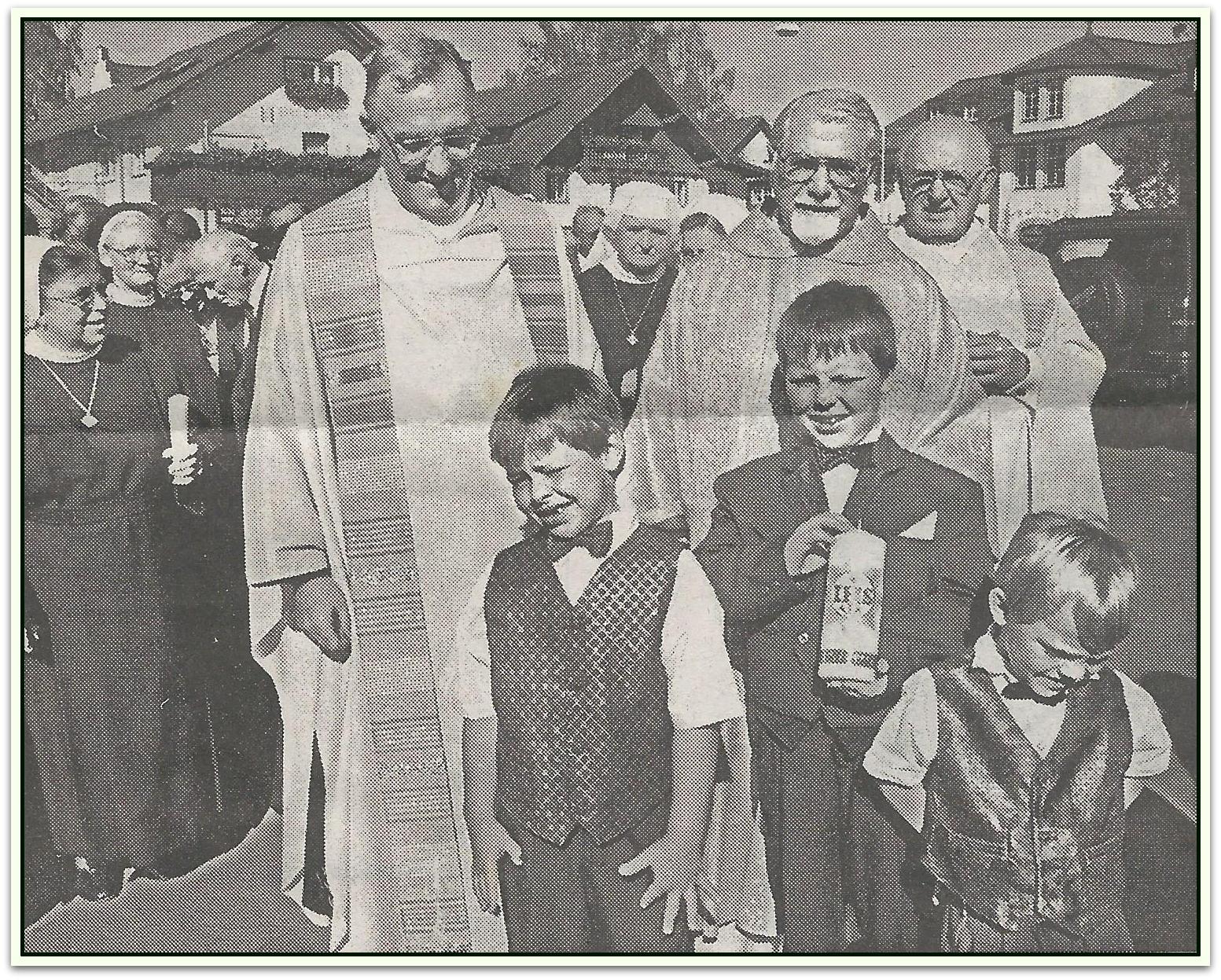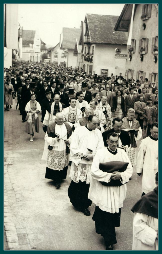 1. Pater Karl Albrecht mit Hostie, links von ihm Pfarrer Heribert Steiner , links außen Pfarrer Miller und Pater Leo vom Kloster Ottobeuren