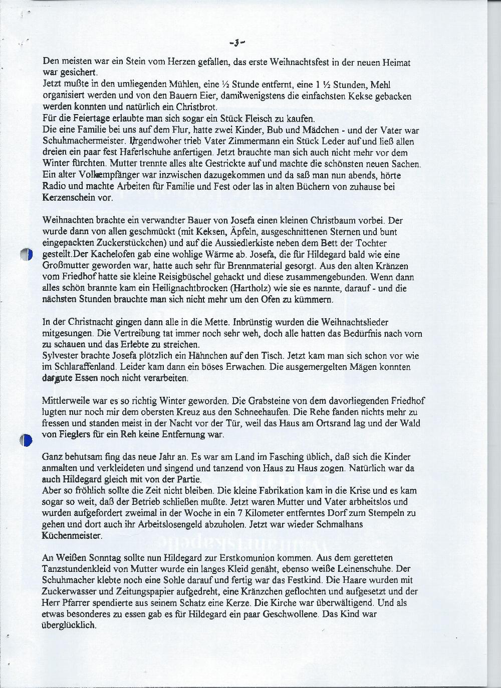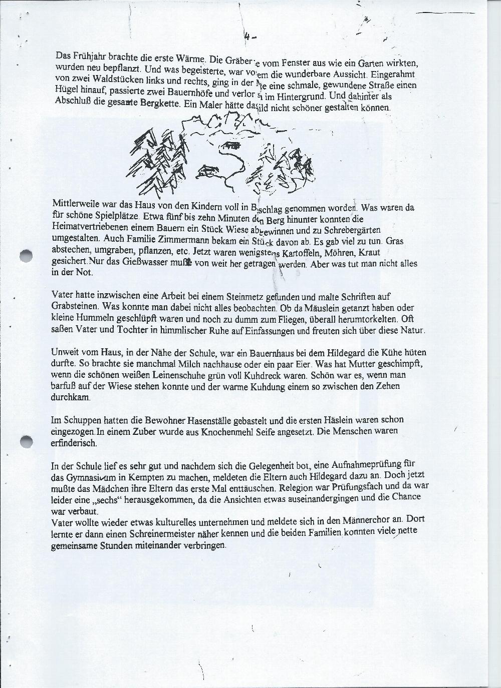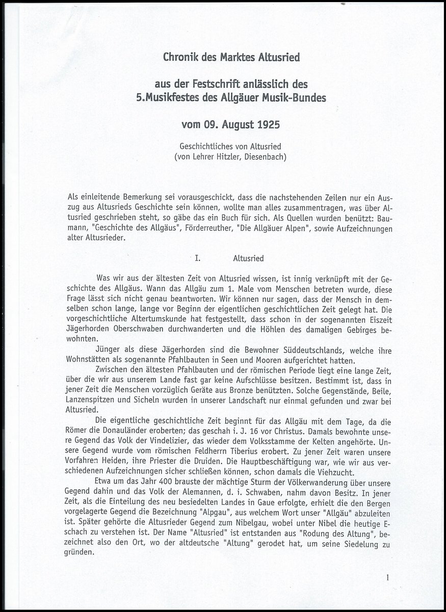1945 und 1946 wurden drei Millionen Sudetendeutsche aus ihrer Heimat vertrieben. Eine Million davon fanden Zuflucht in Bayern. Mit Recht werden sie heute neben Altbayern, Schwaben und Franken als der vierte Stamm bezeichnet. Ohne die Schaffenskraft der Zuwanderer wäre der wirtschaftliche Aufschwung nach dem Krieg nicht möglich gewesen. Der folgende Bericht handelt über die Ankunft und das Sicheinleben der Familie Zimmermann in Altusried. Joseph Zimmermann spielte in den Fünziger und Sechziger Jahren noch eine wichtige Rolle in Altusried. Er war Theatermann, Regisseur für die Freilichtspiele, Reiseleiter, Bücherwart und zuständig für den Fremdenverkehr.