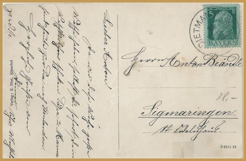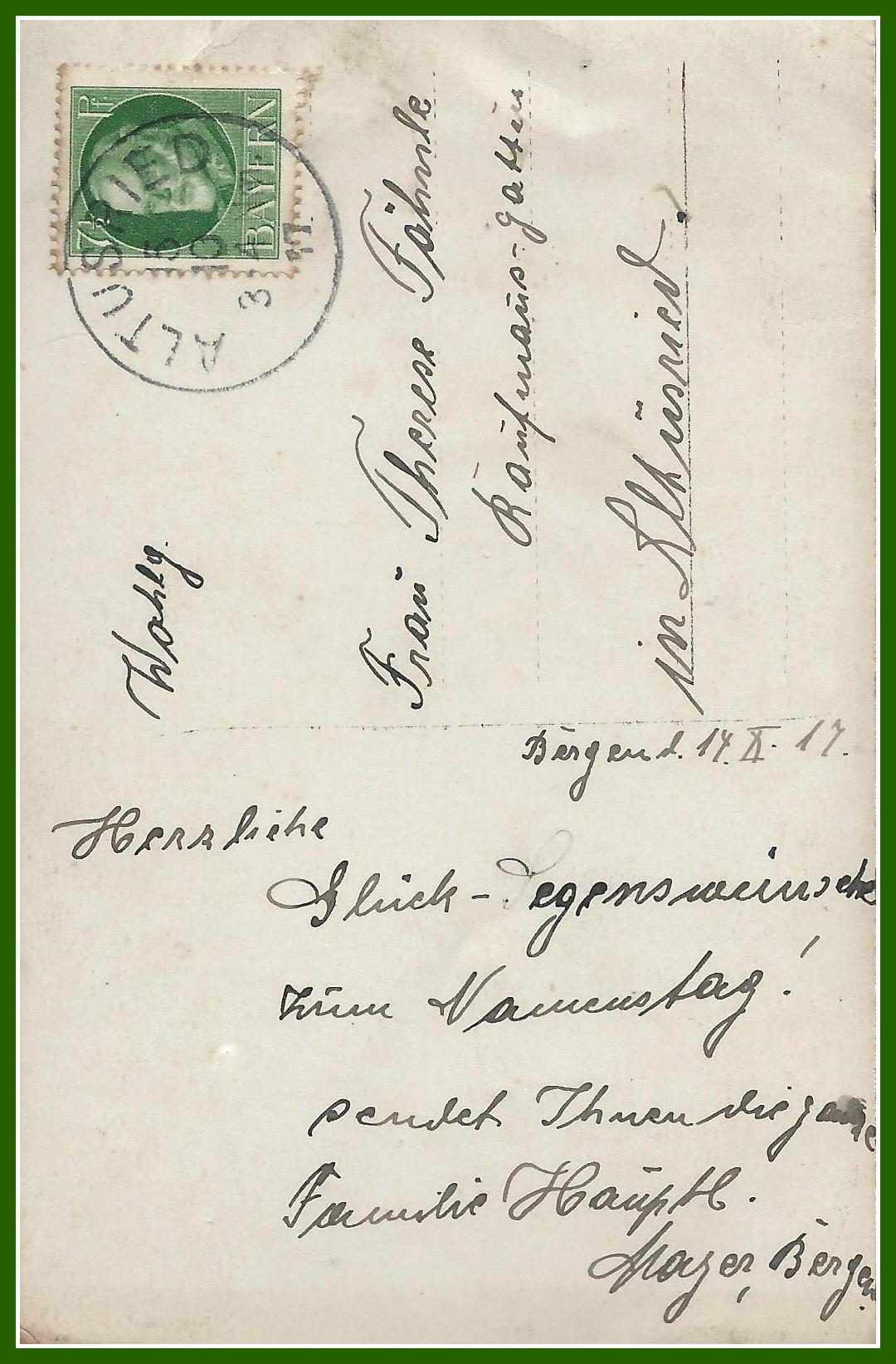 Herzliche Glück und Segenswünsche zum Namenstag ! Sendet Ihnen die ganze Familie Hauptlehrer Mayer, Bergen. Adressiert war die Karte an Frau Therese Fähnle Kaufmannsgattin in Altusried.