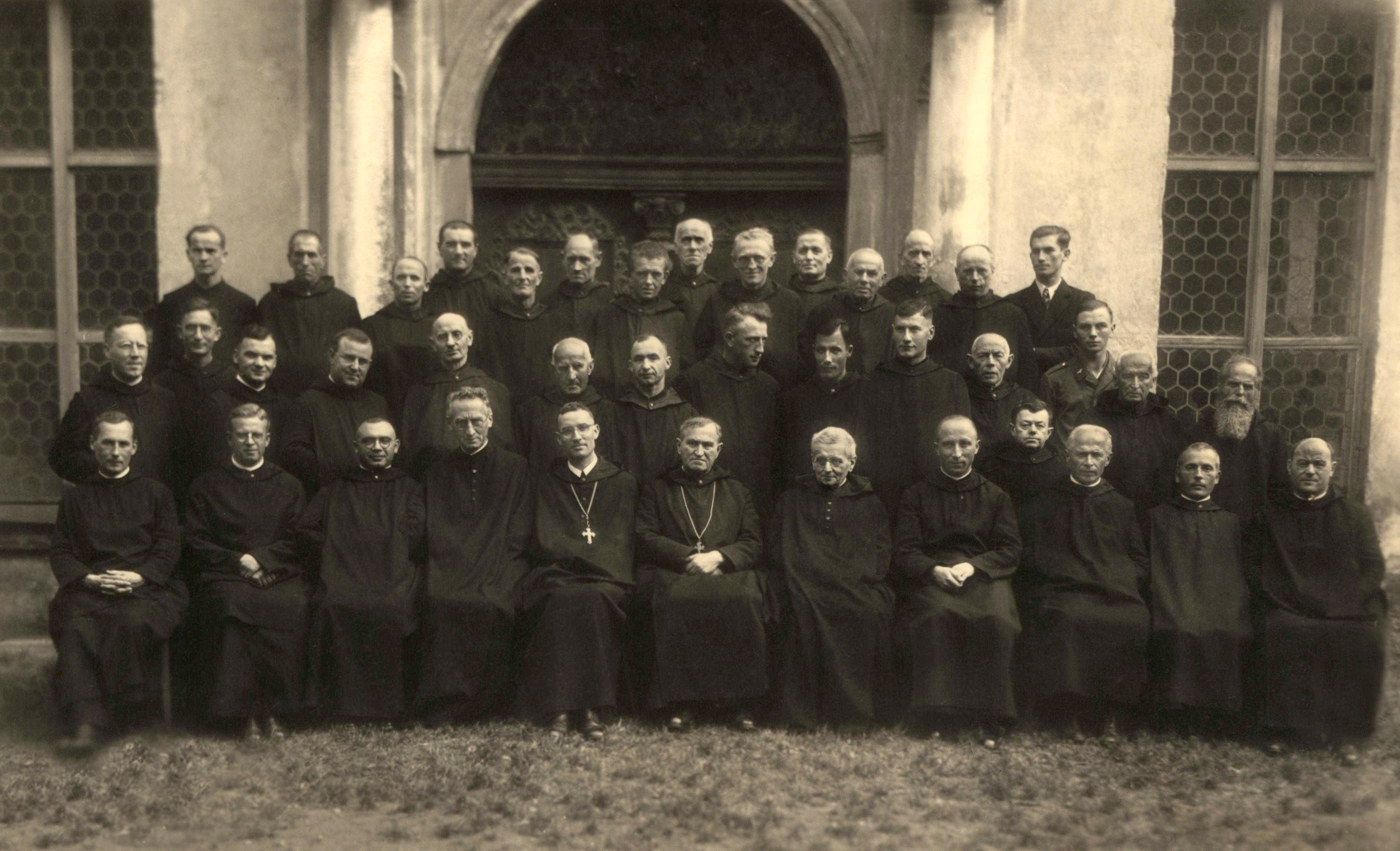 - Zu seinem achzigsten Geburtstag versammeln sich die Pater und Frater am Eingang des Klosters Ottobeuren. Abt Einsiedler in der Mitte der ersten Reihe.